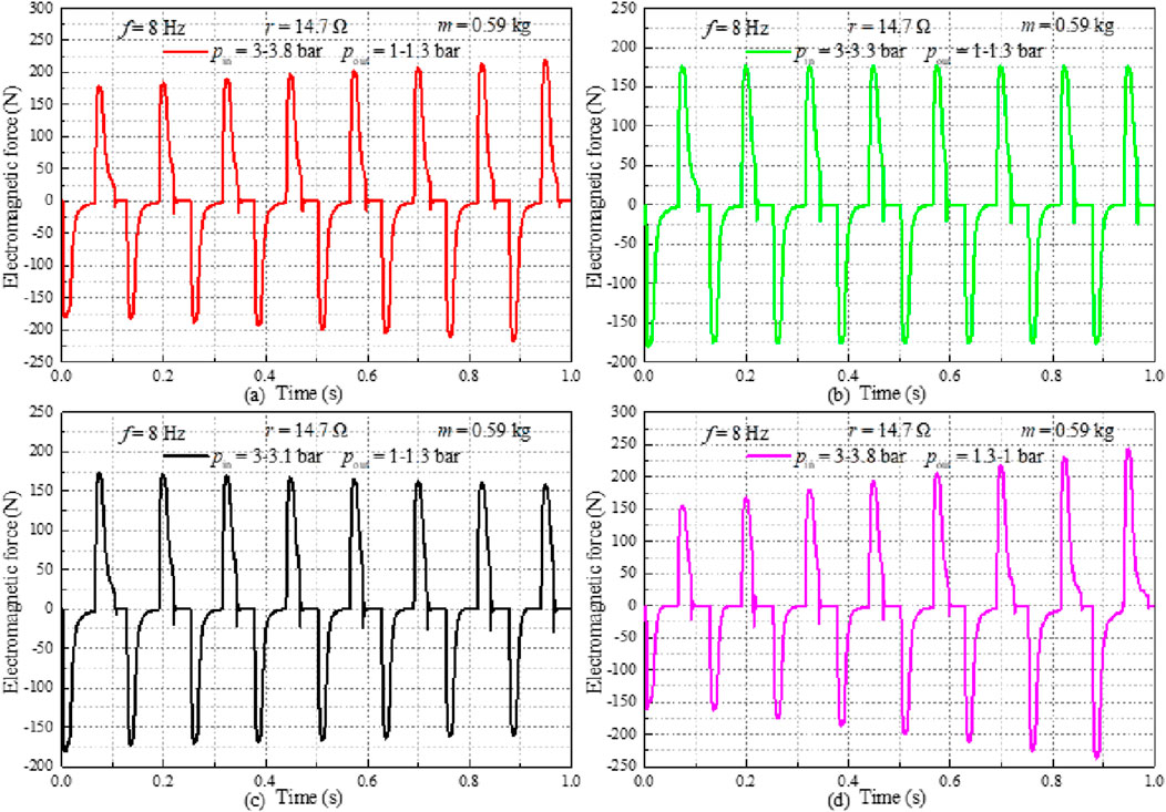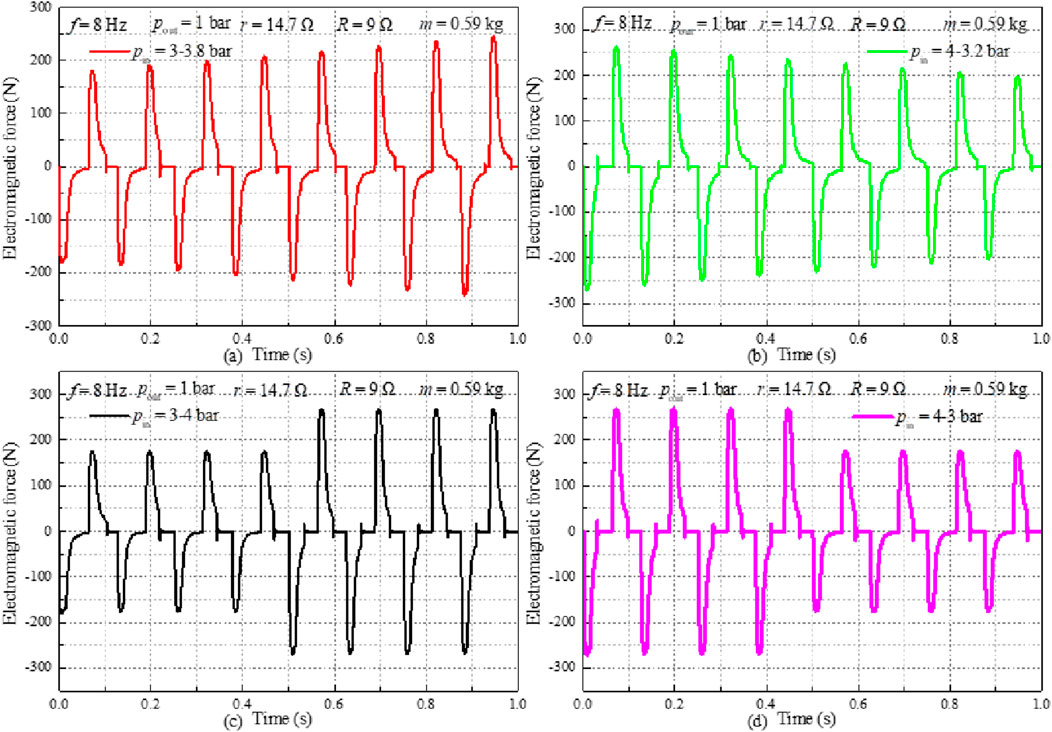 Figure 14. Variation of the electromagnetic force with the changing intake pressure, (a) pin = 3-3.8 bar, (b) pin = 4-3.2 bar, (c) pin = 3-4 bar, (d) pin = 4-3 bar.