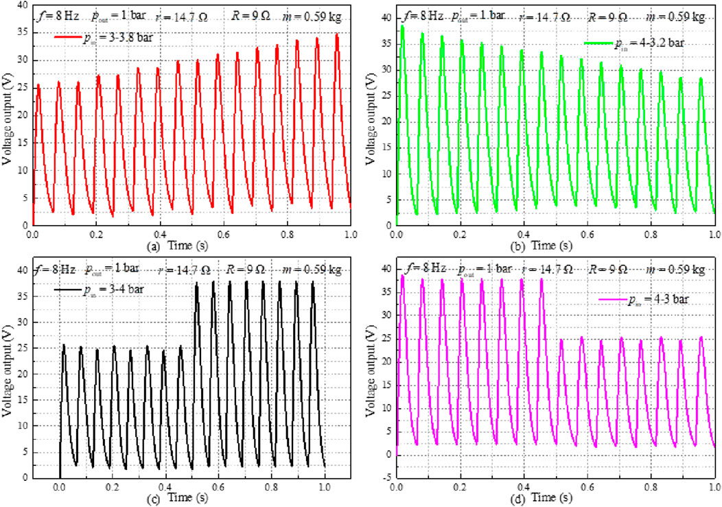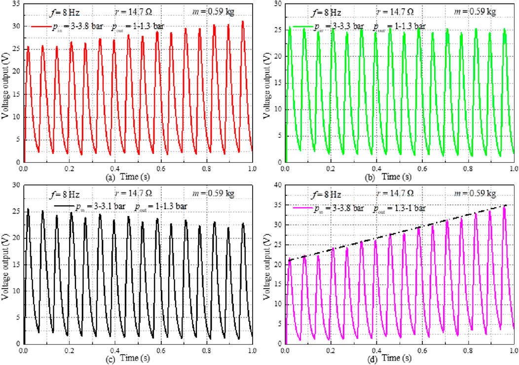 Figure 15. The variation of the voltage output with the changing intake pressure, (a) pin = 3-3.8 bar, (b) pin = 4-3.2 bar, (c) pin = 3-4 bar, (d) pin = 4-3 bar.