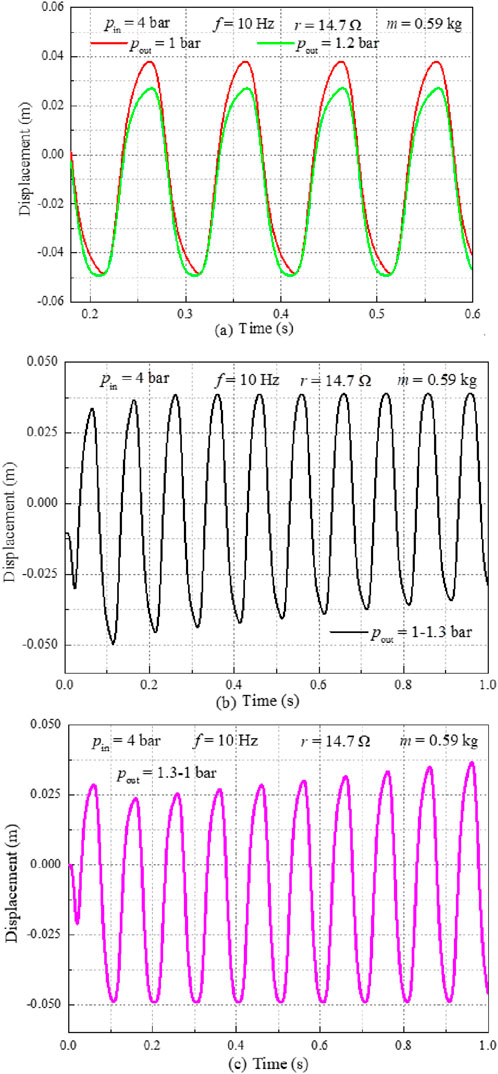 Figure 17. Effect of exhaust back pressure on the displacement of the FPA, (a) pout = 1,2 bar, (b) pout = 1-1.3 bar, (c) pout = 1.3-1 bar.