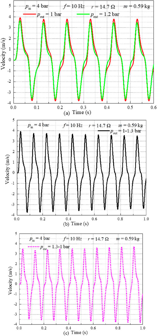 Figure 18. Effect of exhaust back pressure on the velocity of the FPA, (a) pout = 1,2 bar, (b) pout = 1-1.3 bar, (c) pout = 1.3-1 bar.