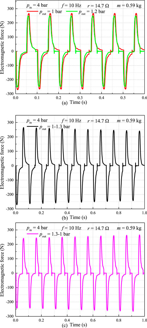 Figure 19. Effect of exhaust back pressure on the electromagnetic force of the LG, (a) pout = 1,2 bar, (b) pout = 1-1.3 bar, (c) pout = 1.3-1 bar.