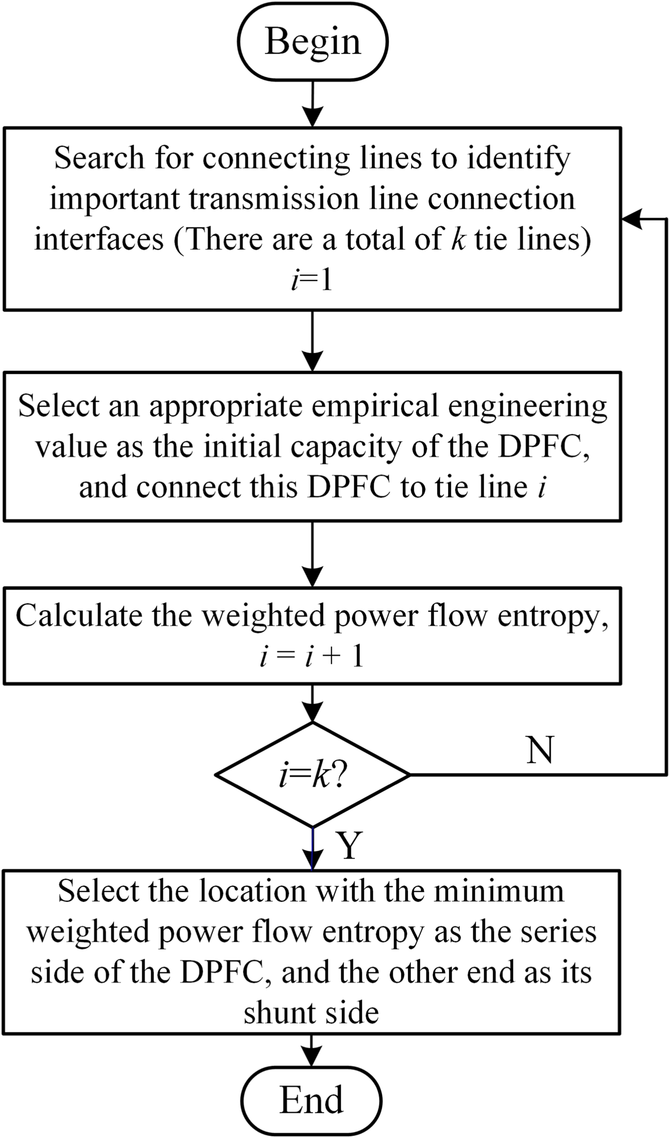5. Choose the position with the minimum weighted power flow entropy among the k connecting lines at the section as the optimal location for installing the DPFC. The calculation process is shown in Figure 1.