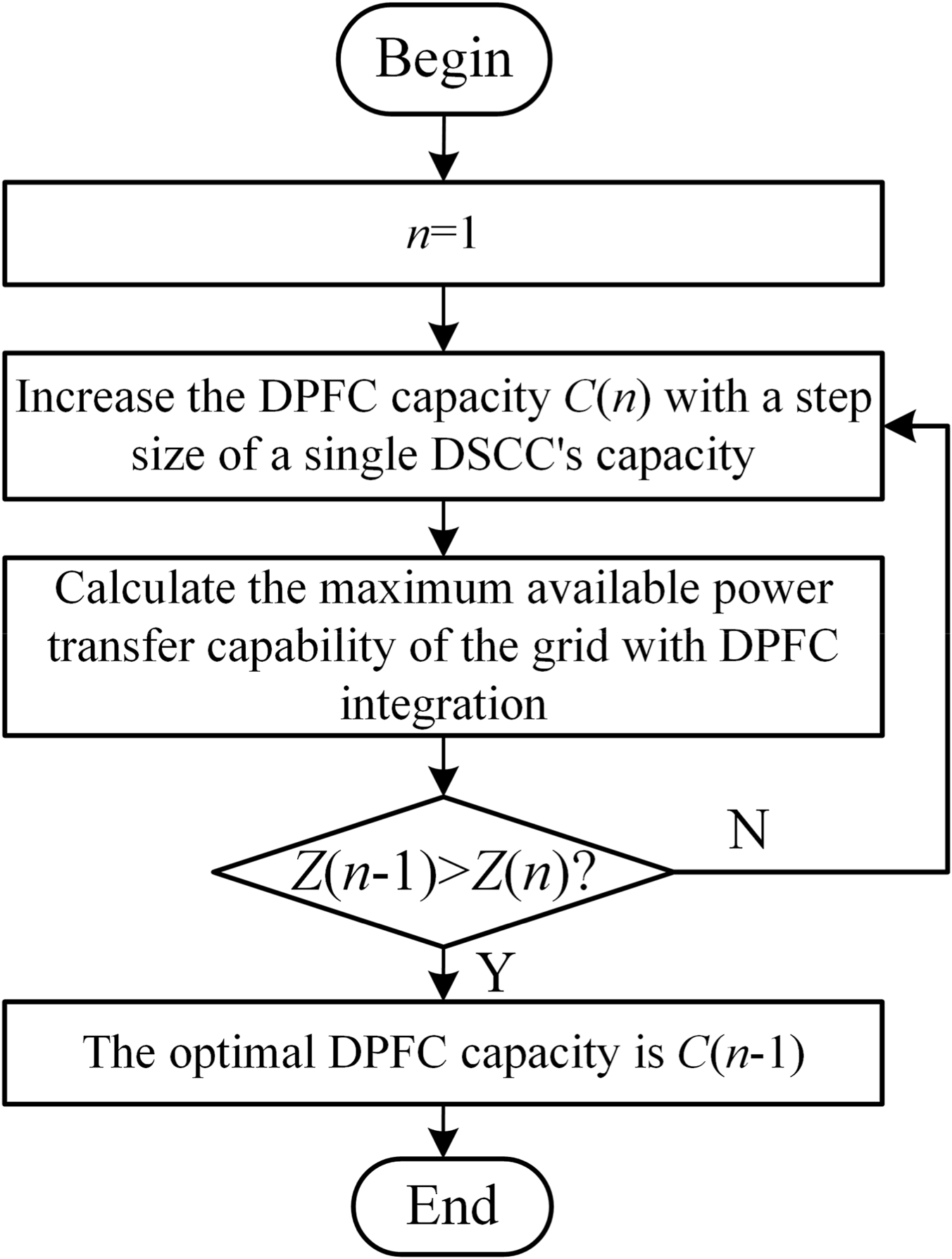 Using a genetic algorithm, the rated capacity of the DPFC will be increased in steps based on the unit capacity of the DSSC. When the grid’s benefit is maximized, the rated capacity of the DPFC at this point will be considered the optimal rated capacity. Figure 2 shows the overall logic flow diagram.