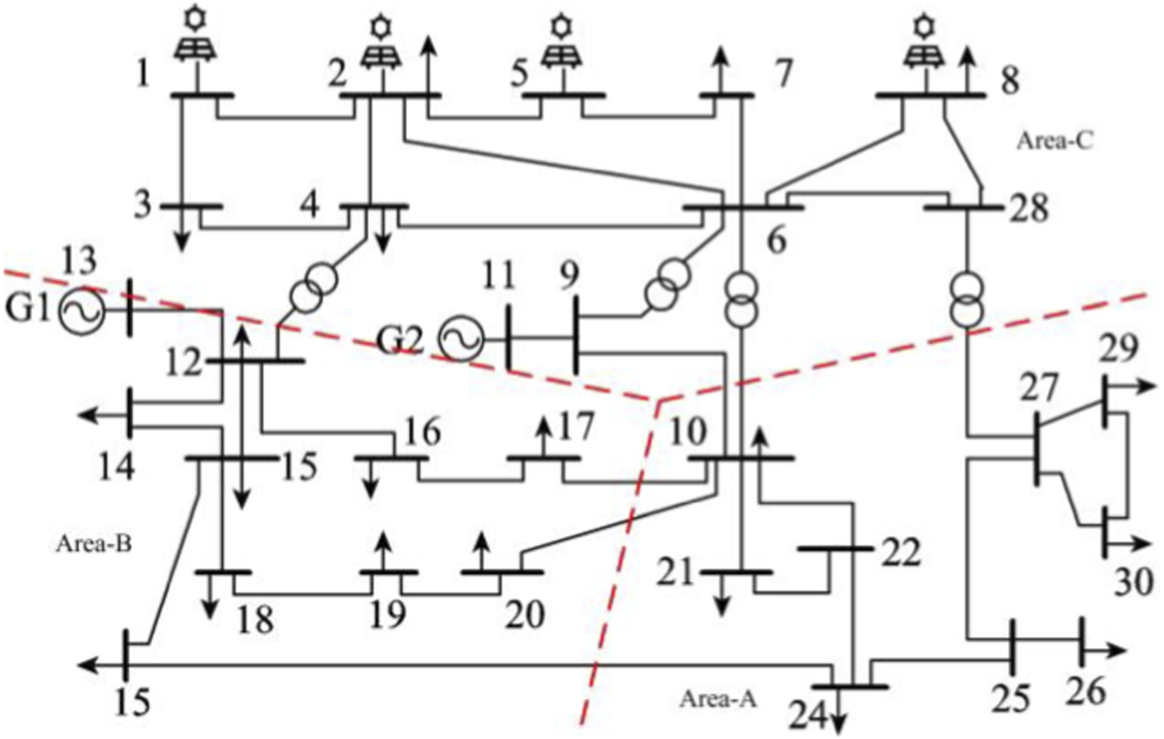 To verify the feasibility of the site selection and capacity determination method for the DPFC, the IEEE 30-bus system from MATPOWER is selected as an example, as shown in Figure 3. The system is divided into three Areas: A, B, and C. Area A is the transmission end, and Area C is the receiving end. Based on the power grid data analysis, it is found that the generation capacity in Area A is relatively abundant, while Area C has a relatively large load in the entire power system. Therefore, based on these characteristics, Areas A and C are selected as the research subjects. The average electricity price pIEAR is set to 0.6 CNY/(kW·h), the discount rate q is 10%, SL is 50 million, and the DPFC operating time is 20 years.