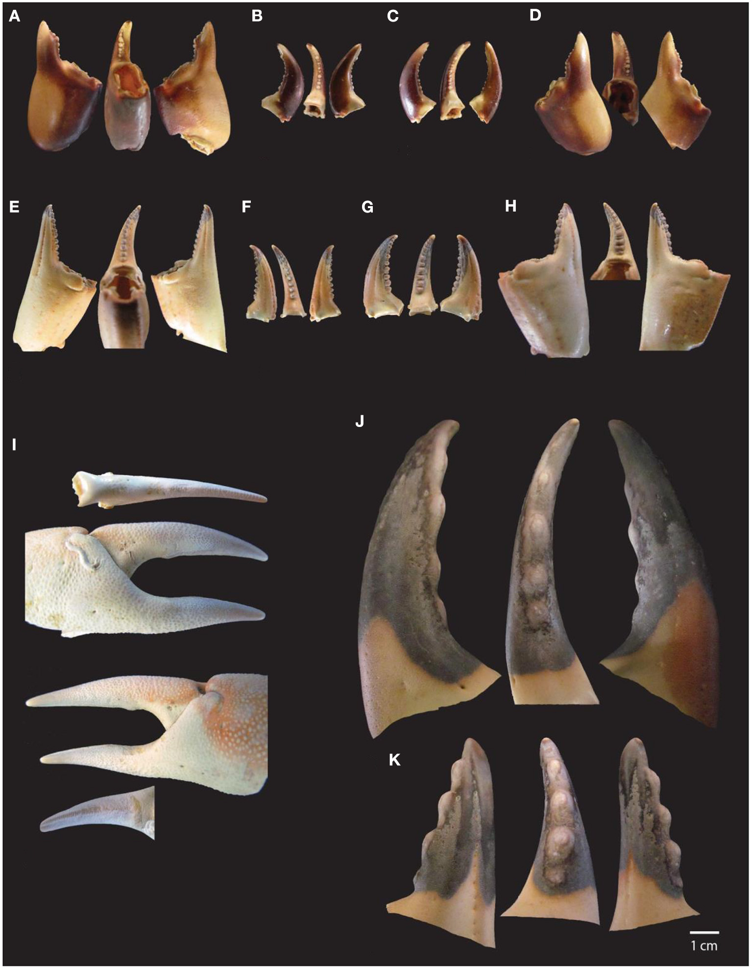 Distinctions between crab species based on claw morphology. In some species, left and right claws show some differences, but in other species they are similar. (A–D)Pachygrapsus marmoratus left propodus (A), left dactylopodus (B), right dactylopodus (C) and right propodus (D). (E–H) Carcinus maenas left propodus (E), left dactylopodus (F), right dactylopodus (G) and right propodus (H). (I)Maja squinado right claw right dactylopodus, right claw on anterior side, right claw on dorsal side and right propodus. (J, K)Cancer pagurus right dactylopodus (J) and right propodus (K).