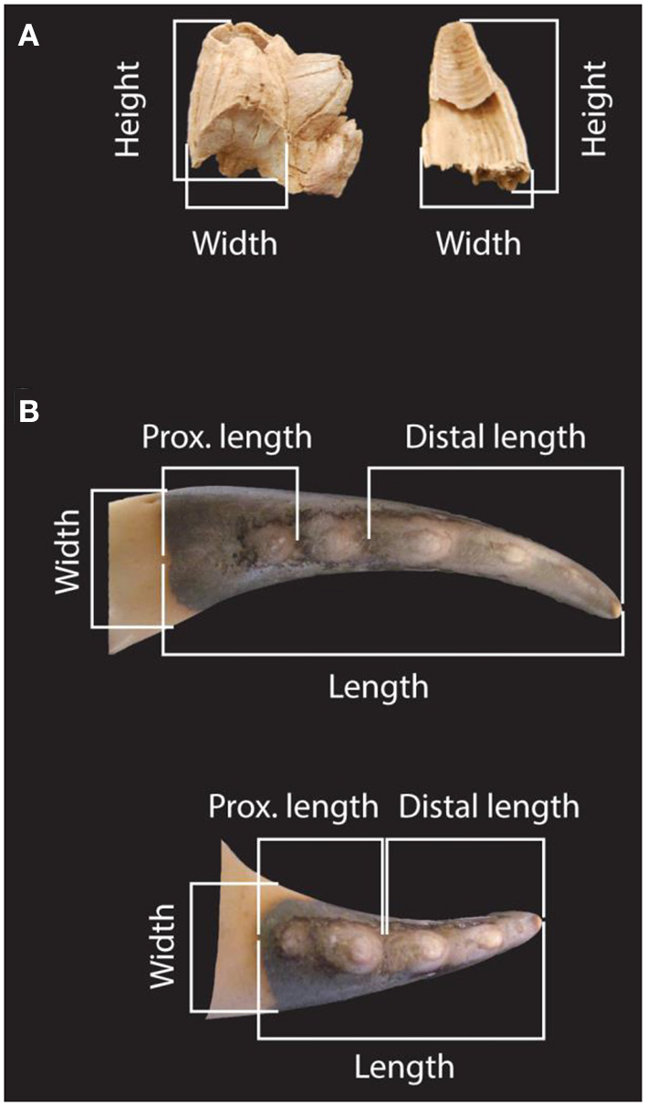 Crustacean biometry. (A) From left to right: Measurements taken on complete barnacles, and complete plate. (B) From top to bottom: Measurements taken on crab dactylopodus (flexible finger) and propodus (unmovable finger); note that proximal and distal lengths should be measured from the interior side of claws, where the protuberances are located, whereas width and length should be measured from the exterior side, where the claw protuberances are absent.