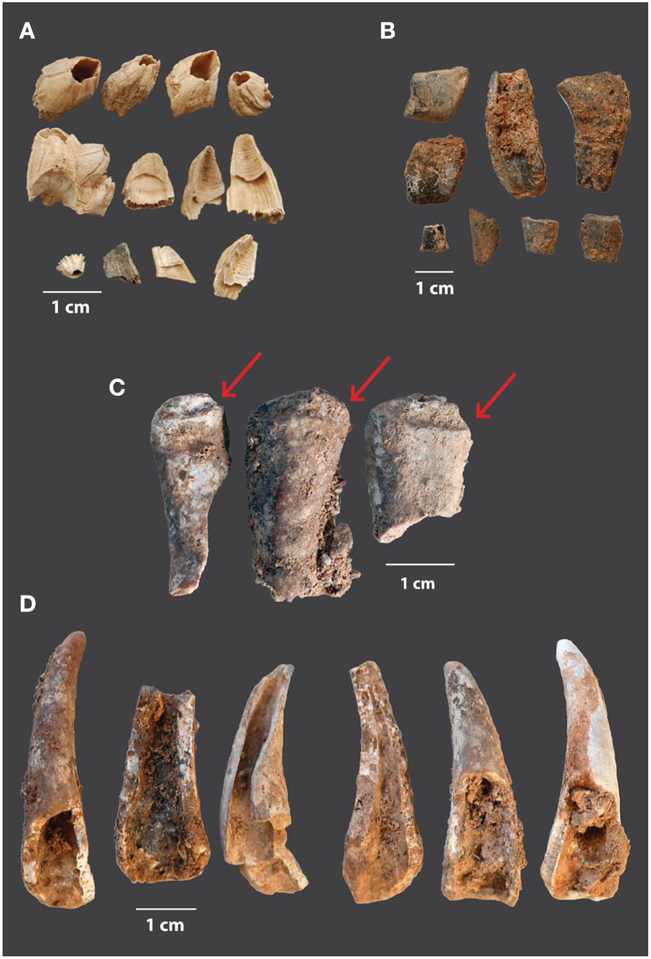 Crustaceans from Gruta da Figueira Brava. (A)Perforatus perforatus recovered from reworked sediment; note their good preservation and absence of calcareous concretion. (B)Cancer pagurus carapace and pincer fragments with black burns; recovered from the MIS-5 deposit. (C)Cancer pagurus dactylopoda showing impact flakes on their ventral proximal side, reflecting pincer disarticulation; recovered from the MIS-5 deposit. (D)Cancer pagurus pincers with longitudinal breaks; recovered from the MIS-5 deposit [Images (B) and (D) are reproduced from Zilhão et al. (2020), published under a CC BY license, with permission from The American Association for the Advancement Studies, original copyright 2020].