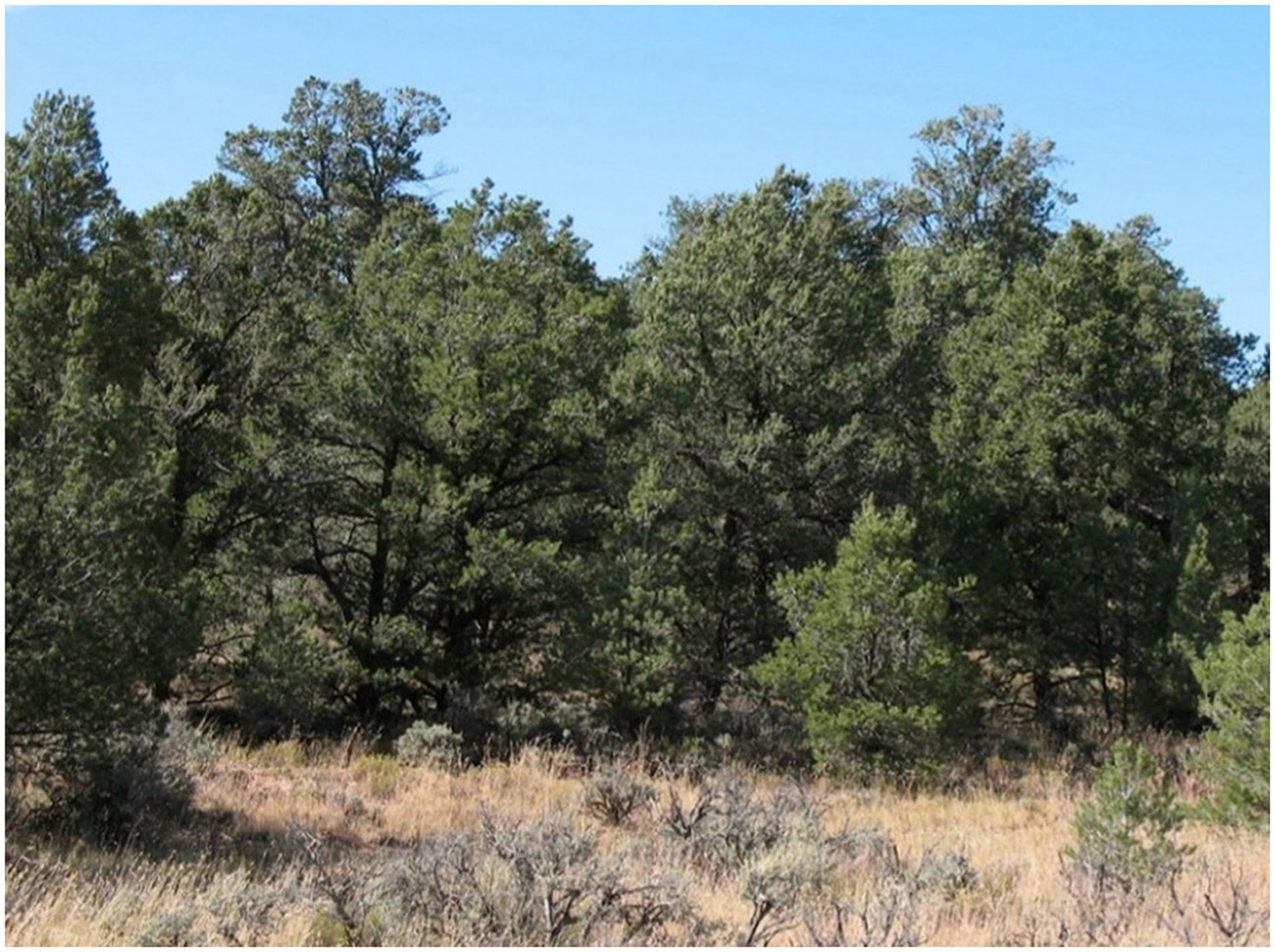 Over-stocked concentration of pinyon and juniper trees showing intermingling of branches and a dense understory, which creates a wildfire-vulnerable fire regime.