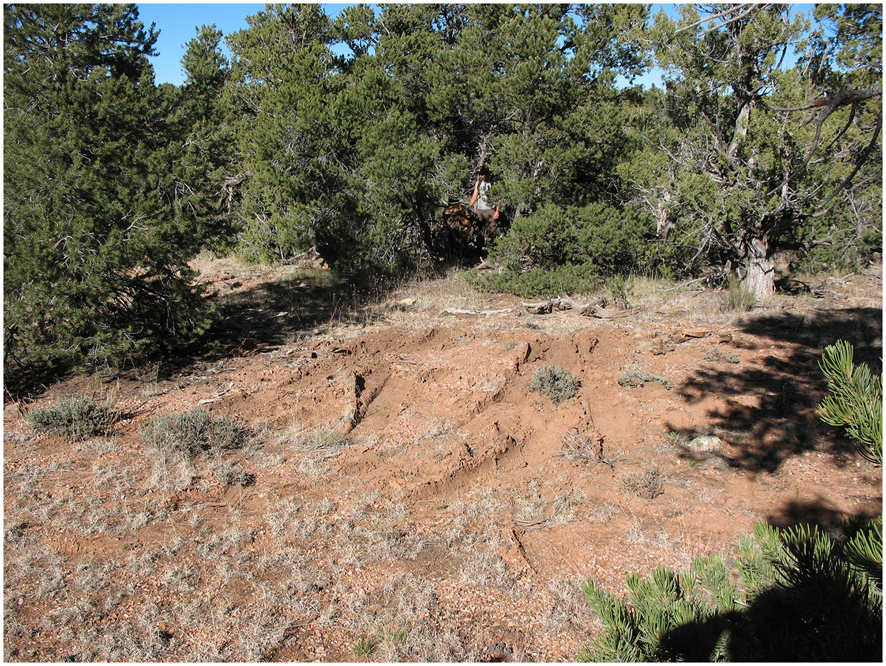 Today, the pinyon-juniper woodland that blankets most of the Upper Basin (Figure 2), which ranges in elevation between 2,255 masl at the South Rim to 1,859 masl at Lee Canyon, is so dangerously overstocked that inter-tree branch comingling makes the woodland highly fire-prone (Vankat, 2013, p. 278–281; Figure 3). In those settings that are covered by dense stands of ponderosa pine (western reaches of the Upper Basin; Merkle, 1952) or by grasslands (eastern reaches of the Upper Basin; Darling, 1967), understory biodiversity has declined significantly because of cattle grazing and elk management (Bye, 1985, p. 379), which has led to the expansion of bare soil patches and the onset of gullying (Williams and Baker, 2013). For the portion of the Upper Basin managed by Kaibab National Forest, uncontrolled recreational camping, permitted and illegal elk and deer hunting, and unpermitted woodcutting have contributed to the severity of erosion (Sullivan et al., 2002a; Uphus et al., 2006).