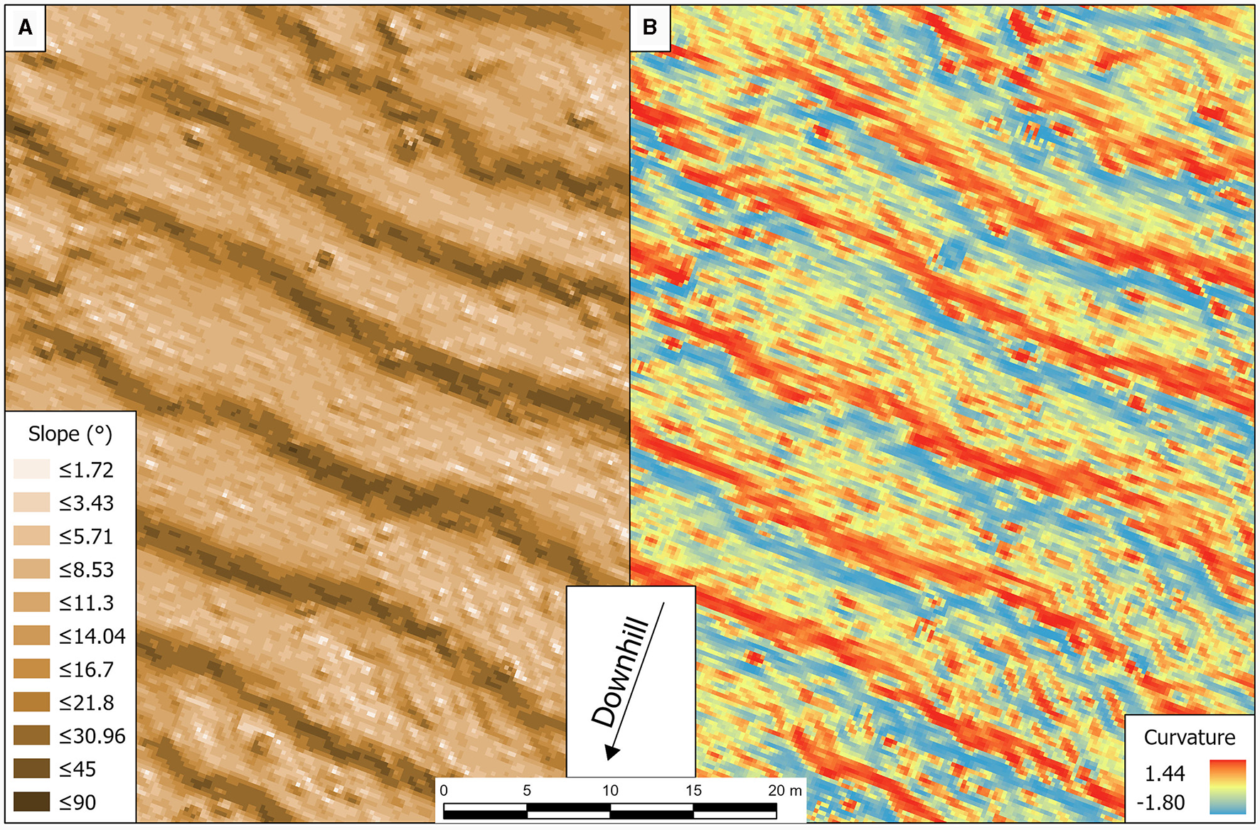 Comparison of slope gradients in ° (A) and curvatures (B) of a selected area of terrace agricultural system Te-07.