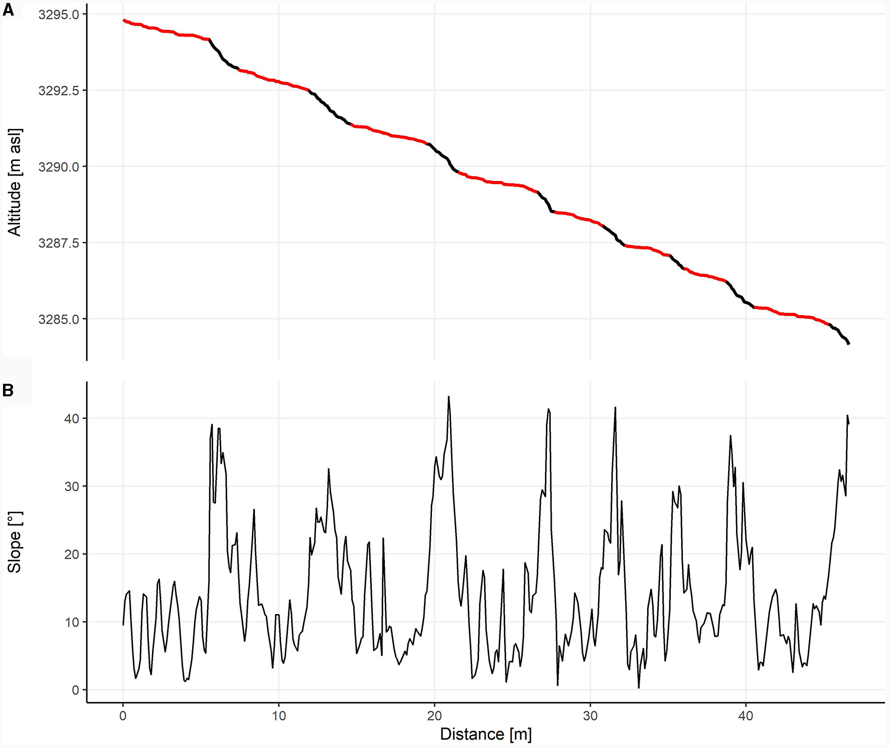 Figure 4. Terrain profile 1 (A) and the corresponding slopes (B). Potential terrace areas (slope < 18.5°) are colored red. The location of the profile is shown in Figure 6.