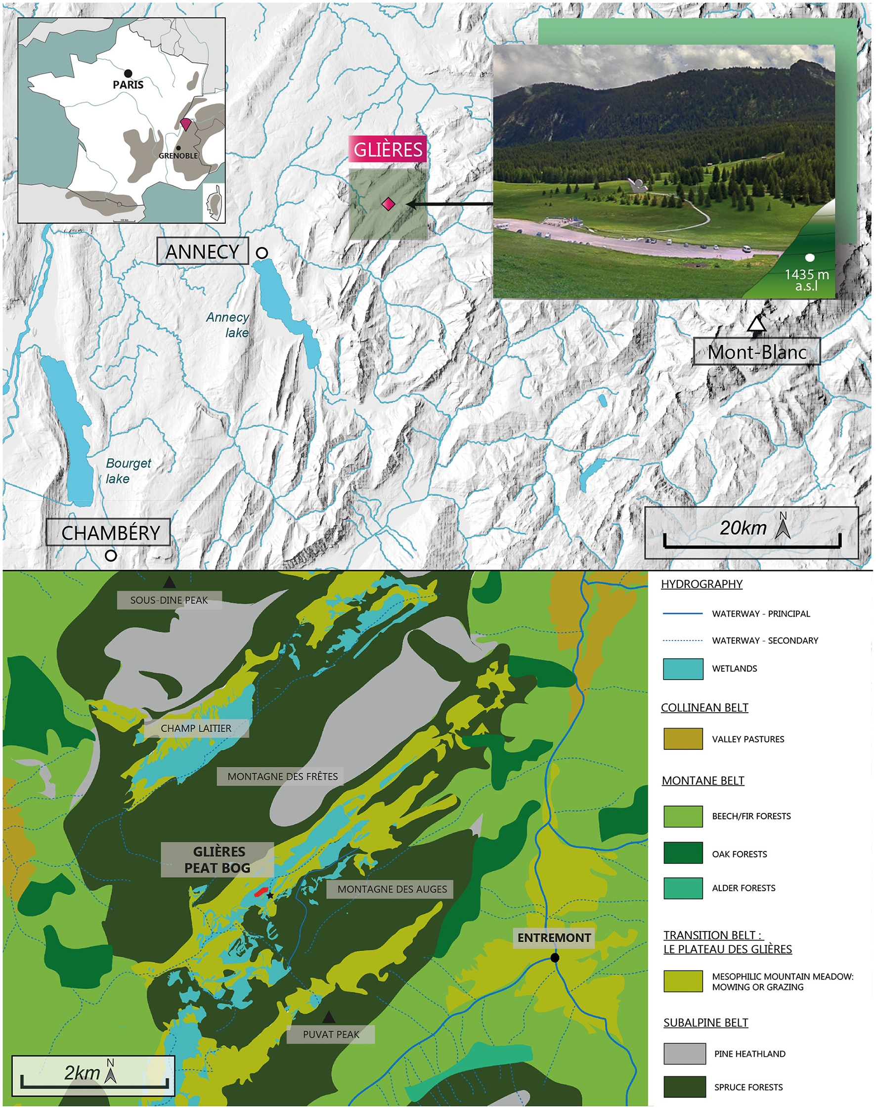 The Col des Glières peat bog is located at an altitude of 1,435 m a.s.l (Figure 1) on the Plateau des Glières in the Bornes-Aravis massif, in the northern Pre-Alps. The Bornes massif is predominantly composed of sedimentary rock, particularly alternating between marls and limestone. More precisely, the Plateau des Glières, especially the peat bog, is made of Flysch and Marls, which are bordered by two mountains mostly made of limestones (Montagnes des Frêtes and Montagnes des Auges on the north-western and south-eastern parts of the Plateau, respectively). The vegetation of the plateau is characterized by mesophilic grassland used for mowing or grazing, wet meadows composed by Molina sp. and acidiphilous meadows with Nardus stricta (Figure 1). Numerous wetlands have also been identified, covering a large part of the plateau and Champ Laitier, further north. The slopes of Montagne des Frêtes, Sous-dine and Les Auges are covered by Picea-Vaccinium myrtillus forests, while the few rocky escarpments are covered by Pinus uncinata heathlands. Finally, the lower slopes are mainly characterized by Fagus-Abies forests. However, a few small areas have been colonized by Quercus sp. and Alnus sp.