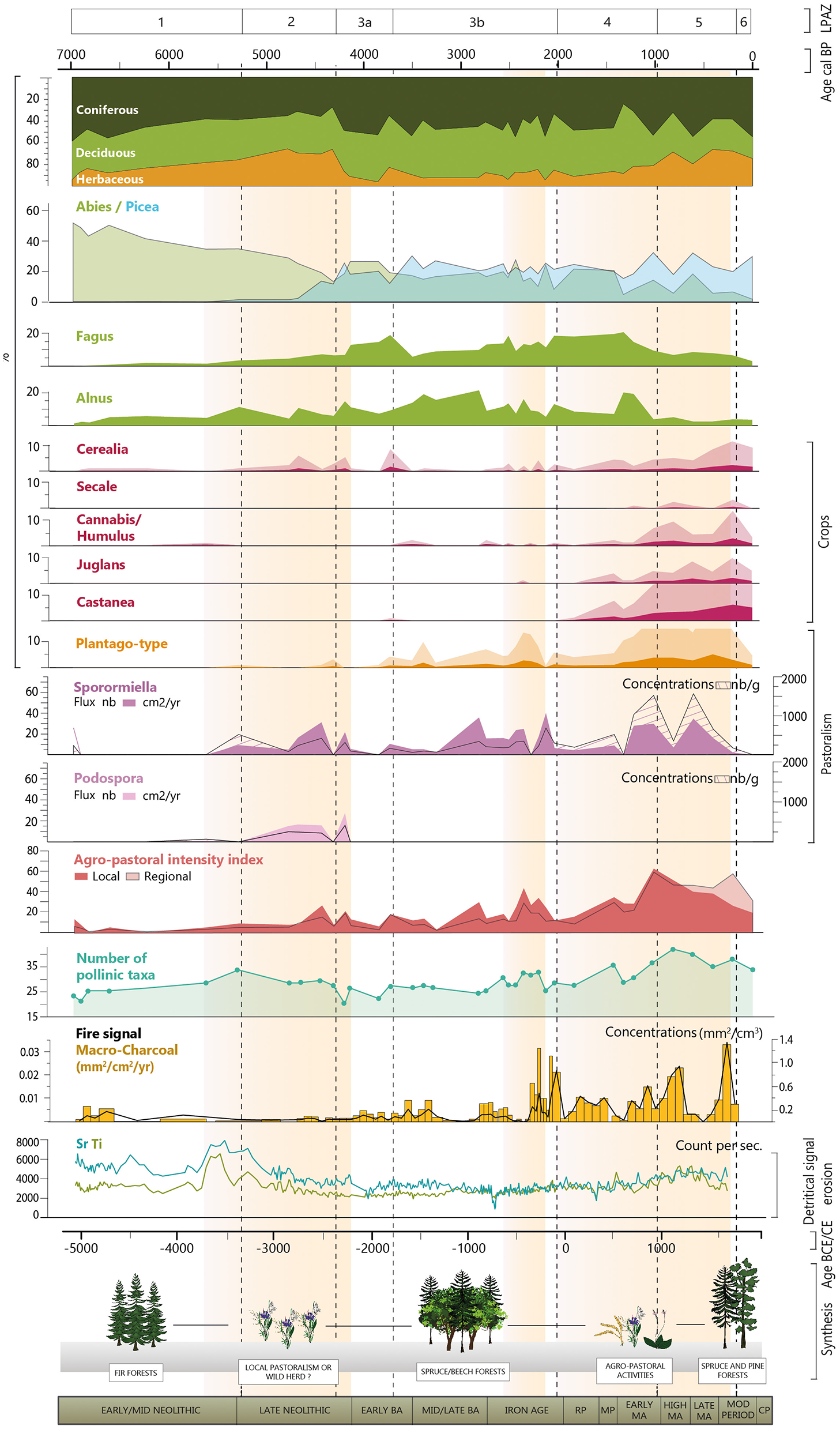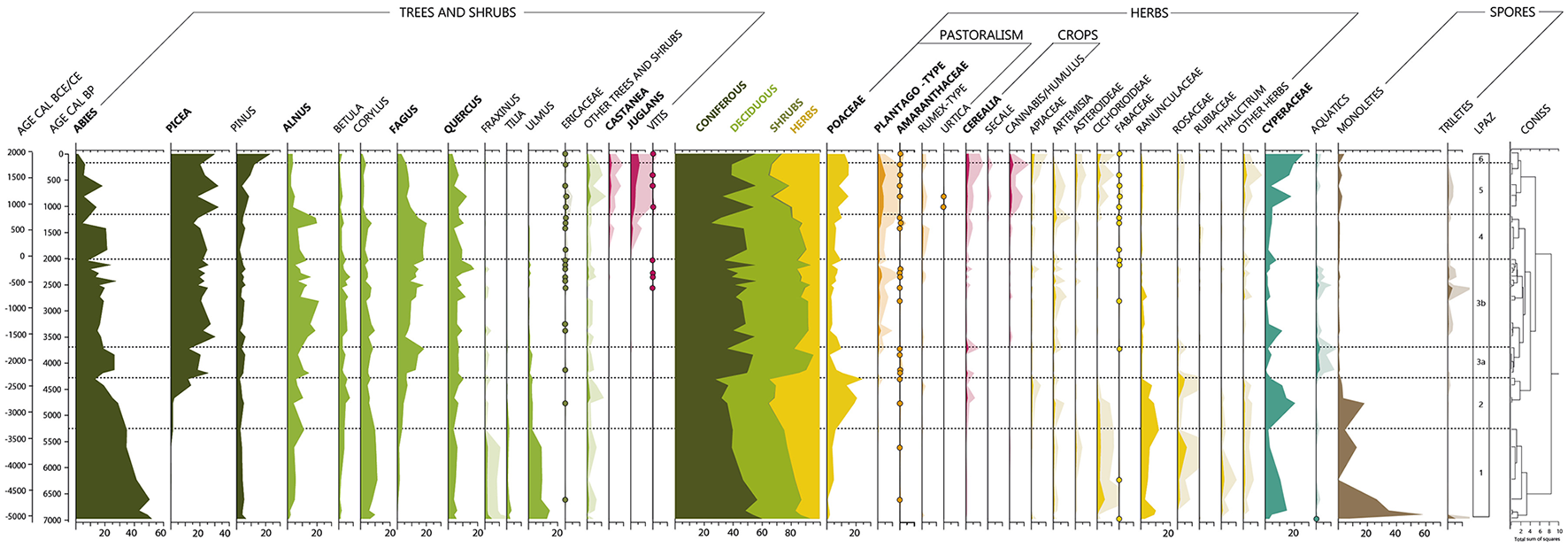 At the beginning of this period, Fagus and Abies decrease significantly, by more than 10% (Figure 3). In contrast, Alnus increases sharply, before decreasing in the middle of the period, around 2700 cal. BP, in parallel with the gradual expansion of Fagus. The other arboreal taxa are stable during this period. Thus, this sub-zone is still characterized by high levels of tree pollen, with significant proportions of Fagus, Alnus, Abies and Picea (over 15%). Regarding herbaceous taxa, whose total abundance does not exceed 16%, values of Plantago-type continue to increase throughout the period. However, although some Cerealia grains are identified, their proportion decreases significantly compared with the two previous zones. During this sub-zone, the Cyperaceae values are the lowest of the entire sequence (<12%).