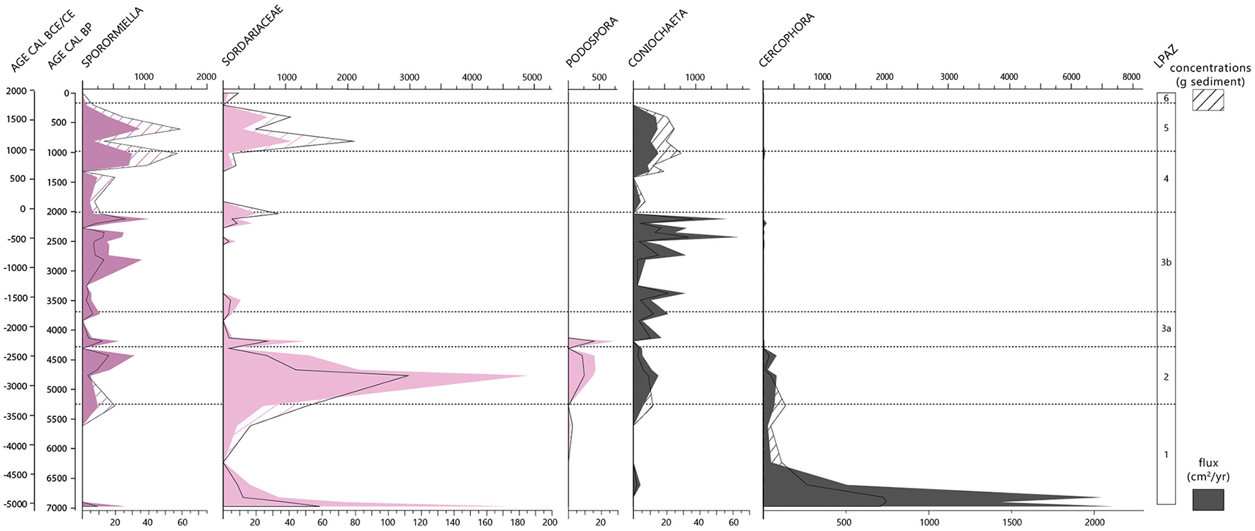 The spores of strict coprophilous fungi (Sporormiella, Podospora) are not very abundant during this phase, but Sporormiella and Sordariaceae tend to increase after 6000 cal. BP (fluxes and concentrations) (Figure 4). Cercophora, on the other hand, shows the opposite trend, with a concentration reaching its highest value but declining sharply until the end of the period.