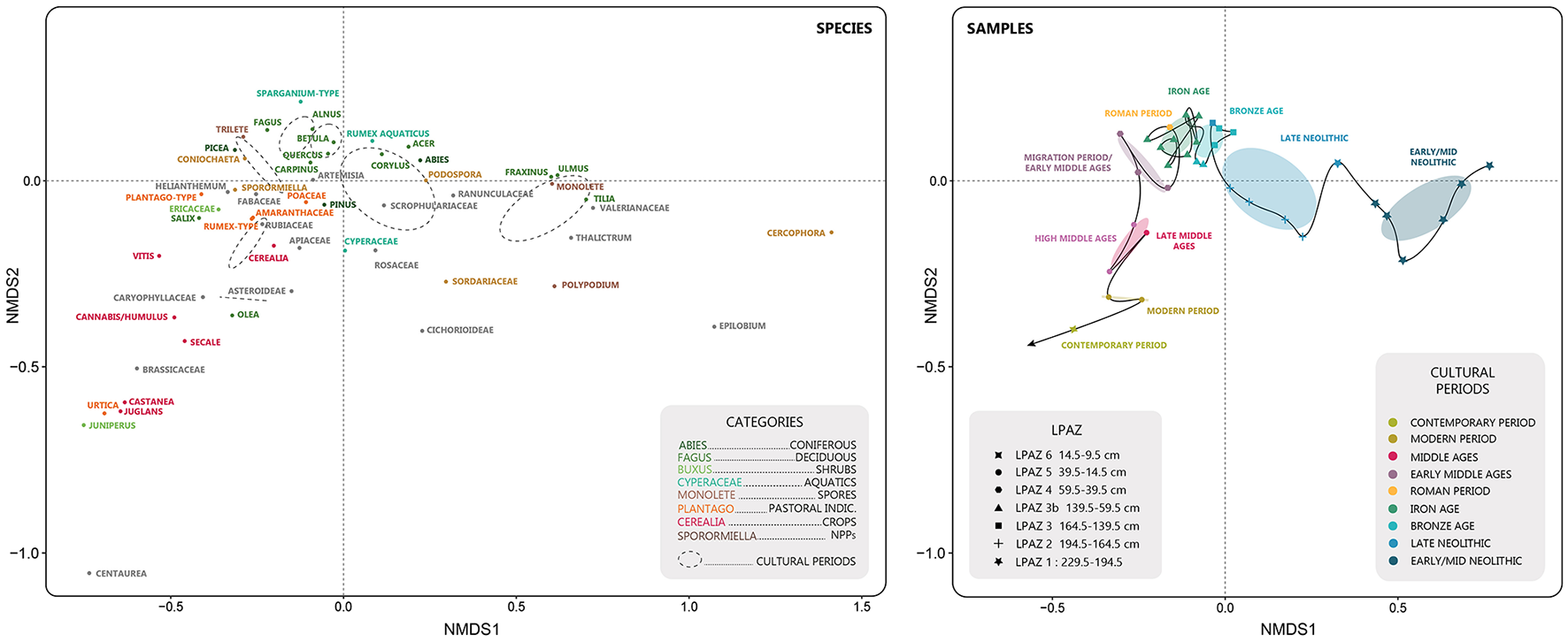 An NMDS analysis was conducted utilizing the “MetaMDS” function within the Vegan package on the RStudio software (Posit Team, 2022). This analysis, which was specifically designed for the study of ecological communities, is considered to be the most robust gradient analysis and ordination method for studying this type of variable (Minchin, 1987). The NMDS ellipses were generated on the basis of the cultural periods to which the samples belong (Table 2). In order to combine the proportions of pollen taxa and the concentrations of spores of coprophilous fungi on the same NMDS, the two types of data were standardized. A threshold of 0.3% was applied to all pollen taxa in order to prevent taxa with a low occurrence from masking the overall dynamics.