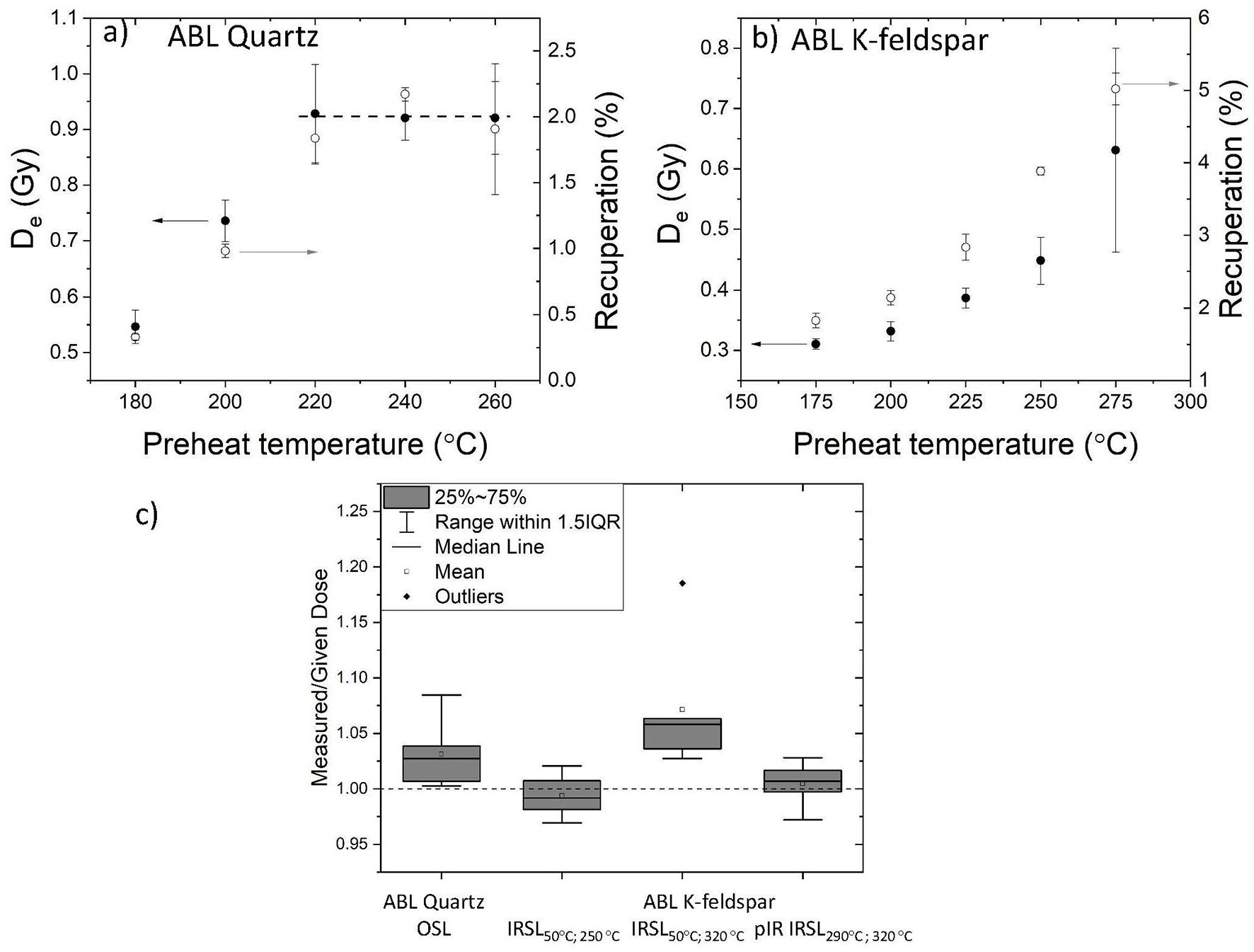 Preheat plateau test results using coarse grain quartz OSL (A) and IRSL of coarse grain K-feldspar (B). The aliquots were not bleached and hence the dose was natural. Each point is the average of three aliquots. (C) Dose recovery test results with preheat temperature of 240°C for quartz OSL, 250°C for K-feldspar IRSL50°C and 320°C for IRSL50°C and pIR IRSL290°C.