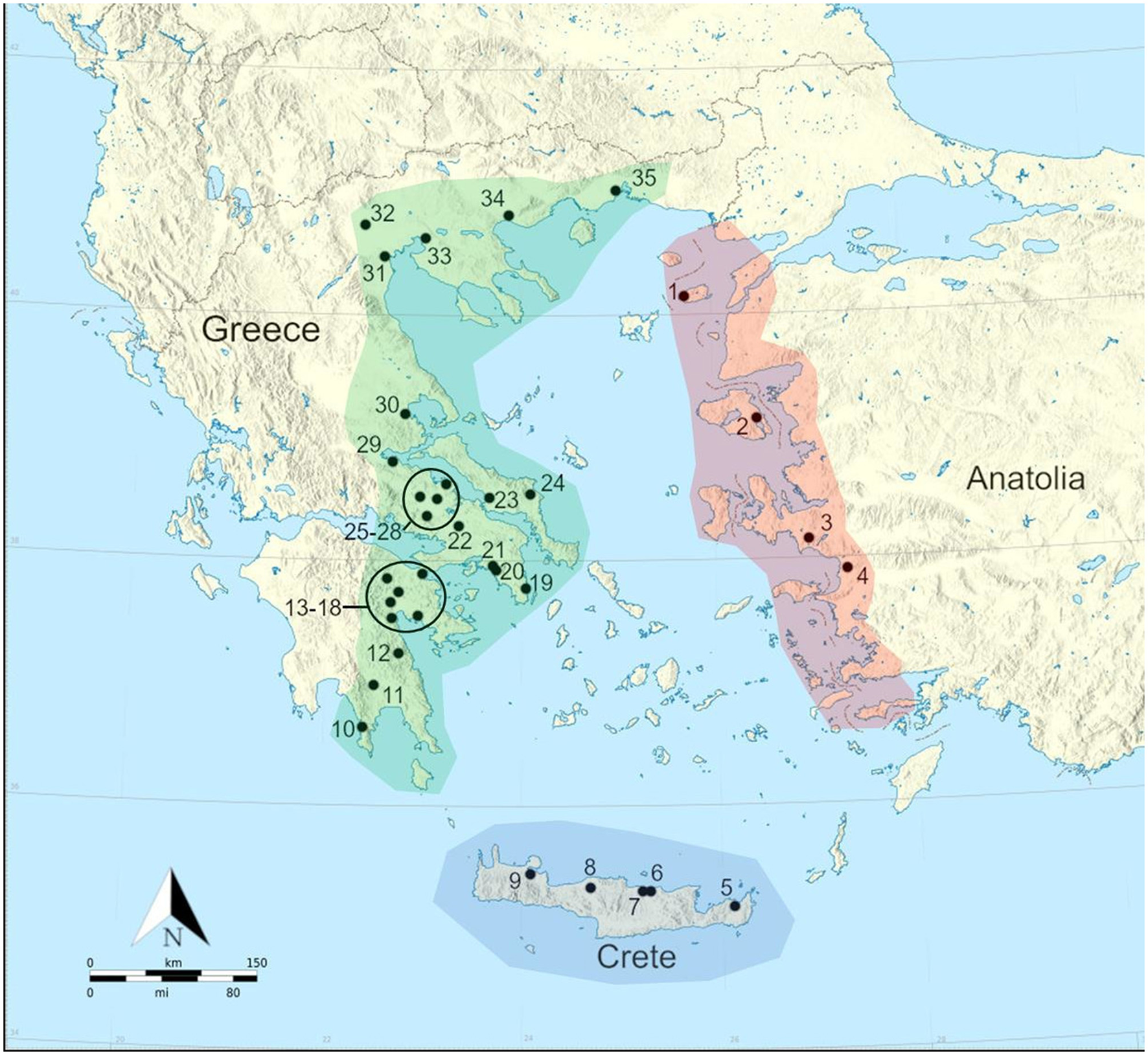 Map of sites with δ13C and δ15N values from bulk bone collagen of adult humans examined in this paper. 1: Uǧurlu; 2: Mitilini; 3: Bakla Tepe; 4: Ephesus: 5: Petras; 6: Kastella; 7: Knossos; 8: Eleutherna; 9: Stylos; 10: Alepotrypa Cave; 11: Kouphovouno; 12: Socha; 13: Lerna; 14: Asine; 15: Aspis; 16: Mycenae; 17: Nemea; 18: Almyri; 19: Laurion; 20: Kerameikos; 21: Plateia Kotzia; 22: Thebes; 23: Manika; 24: Tharrounia; 25: Kalapodi; 26: Zeli; 27: Hagios Sozon; 28; Halai; 29: Ayios Dimitrios; 30: Halos; 31: Makriyalos; 32: Archontiko; 33: Thessaloniki Toumba; 34: Nea Kerdylia-Strovolos; 35: Abdera. The polygons approximately demarcate the different sub-regions defined in this paper: red = East Aegean; blue = Crete; green = West Aegean.