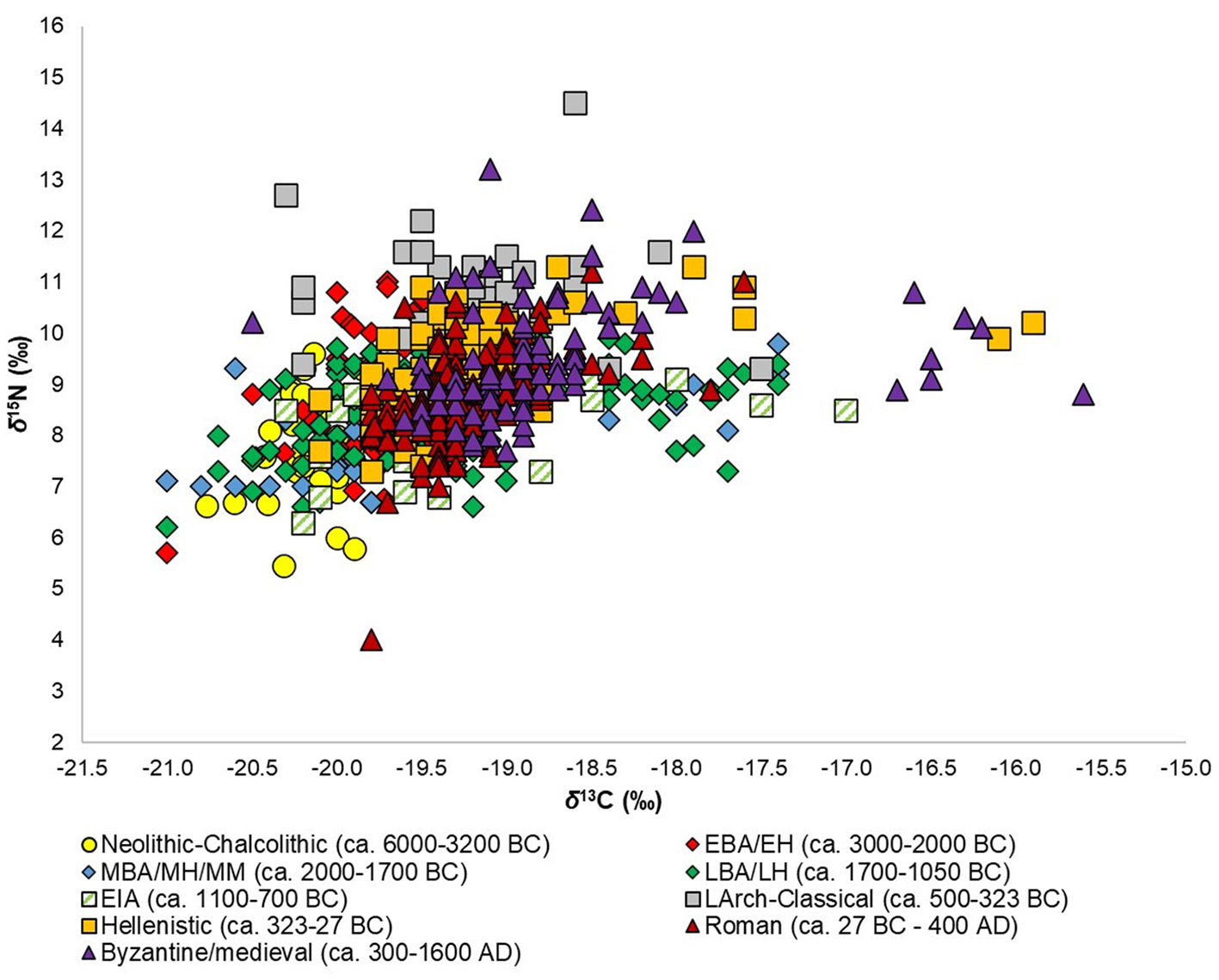 | LArch-Classical (ca. 500–323 BC) | 46 | −19.2 ± 0.5 | 2.8 | −20.3 | −17.5 | 10.6 ± 1.0 | 5.7 | 8.8 | 14.5 |