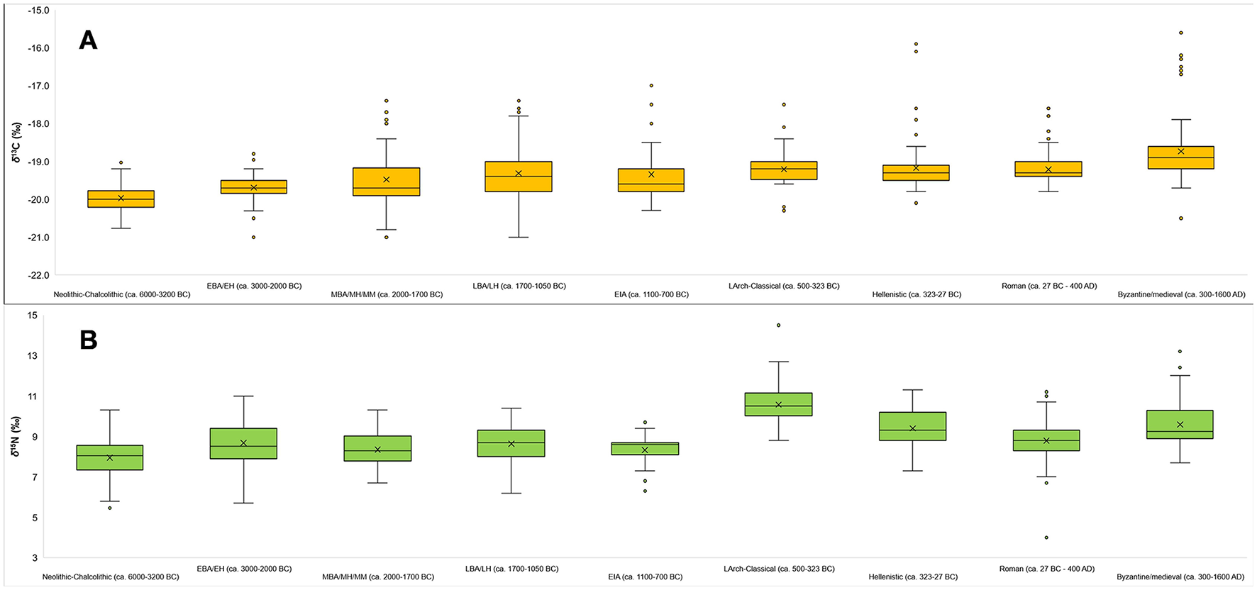 From the data and their visualizations in Figures 2, 3 we can observe that there is a general increase in the mean δ13C values over time from −20.0 ± 0.4‰ in the Neolithic-Chalcolithic to −18.7 ± 0.8‰ in the Byzantine/medieval period. A general increase in the range of δ13C values over time is also observed, with the exception of the Late Archaic-Classical and Roman periods (Table 2). For δ15N values there is more variability and no clear observable patterns over time, although we can perhaps say that after the EIA δ15N values tend to be around or above 9‰ (Table 2; Figures 3, 5). Interestingly, in the Roman period, whilst it has one of the lowest ranges for δ13C values (2.2‰, from −19.8‰ to −17.6‰ —Table 2), it has the greatest range in δ15N values (7.2‰, from 4.0‰ to 11.2‰ — Table 2).
