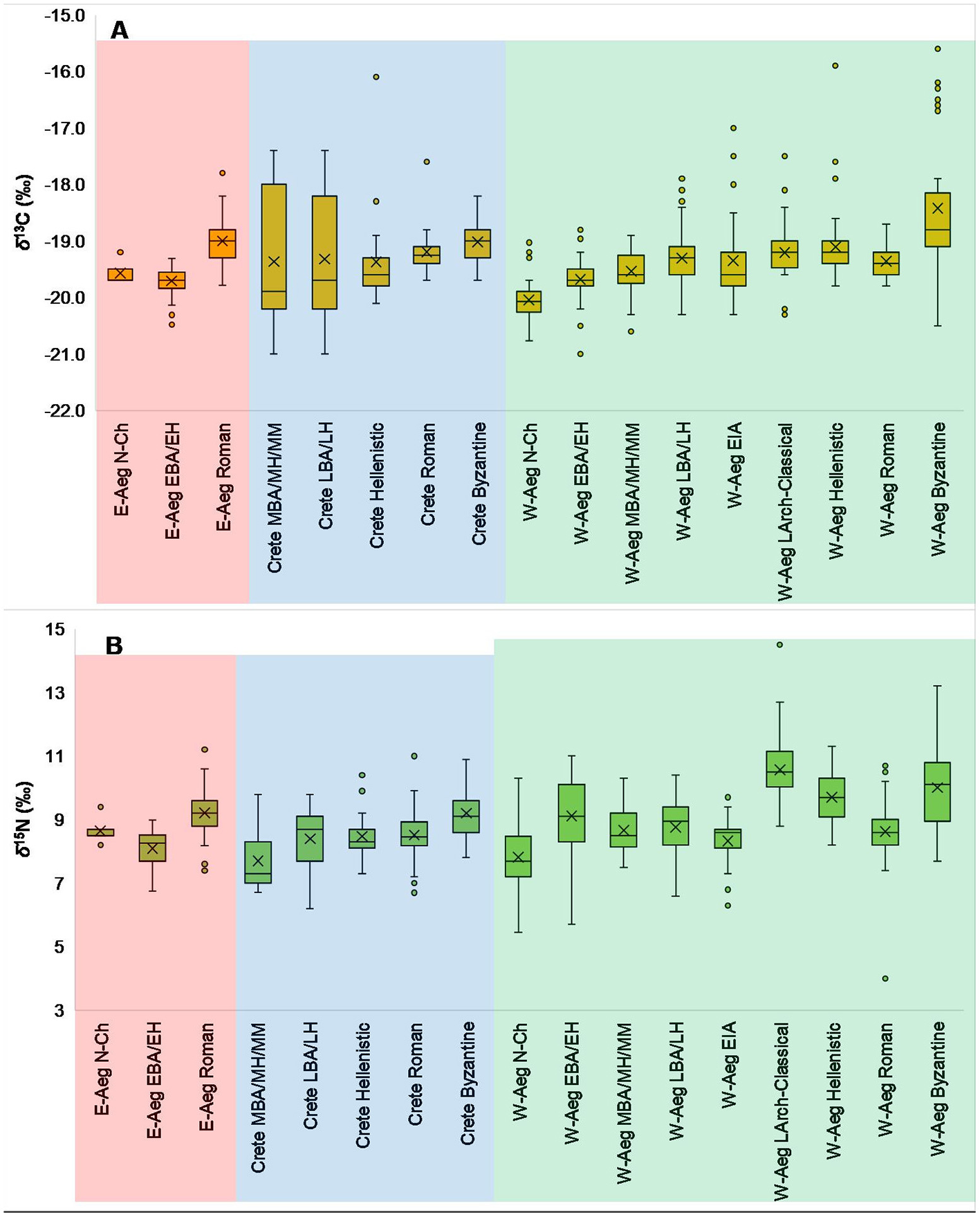Box and whisker plots for δ13C (A) and δ15N (B) values by chronological group for the entire Aegean World (i.e., from sites and populations examined in this study).