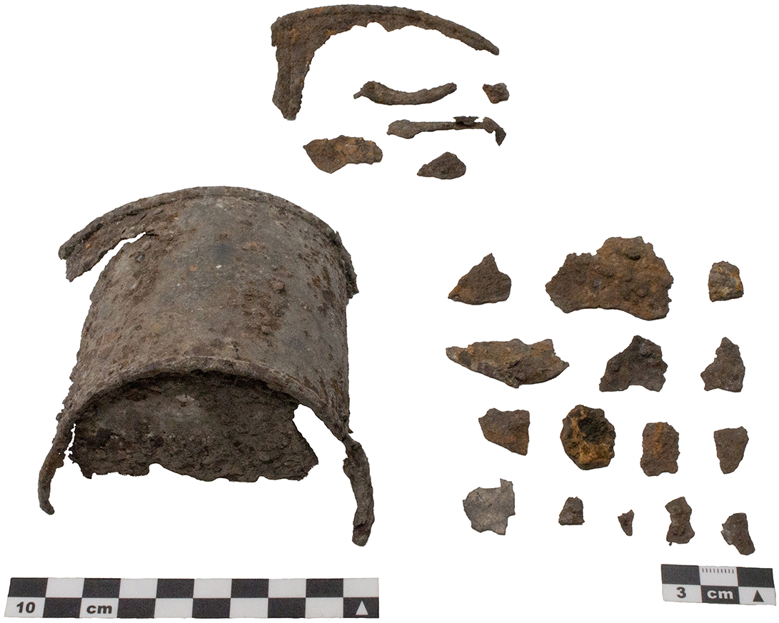 Rusted fragments of an ancient Roman bucket, arranged on a plain surface. The largest piece resembles part of a curved cylinder, while smaller pieces are scattered nearby. Two measurement scales indicate size, with one marked at ten centimeters and the other at three centimeters.