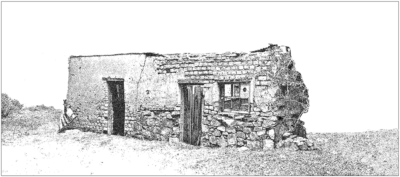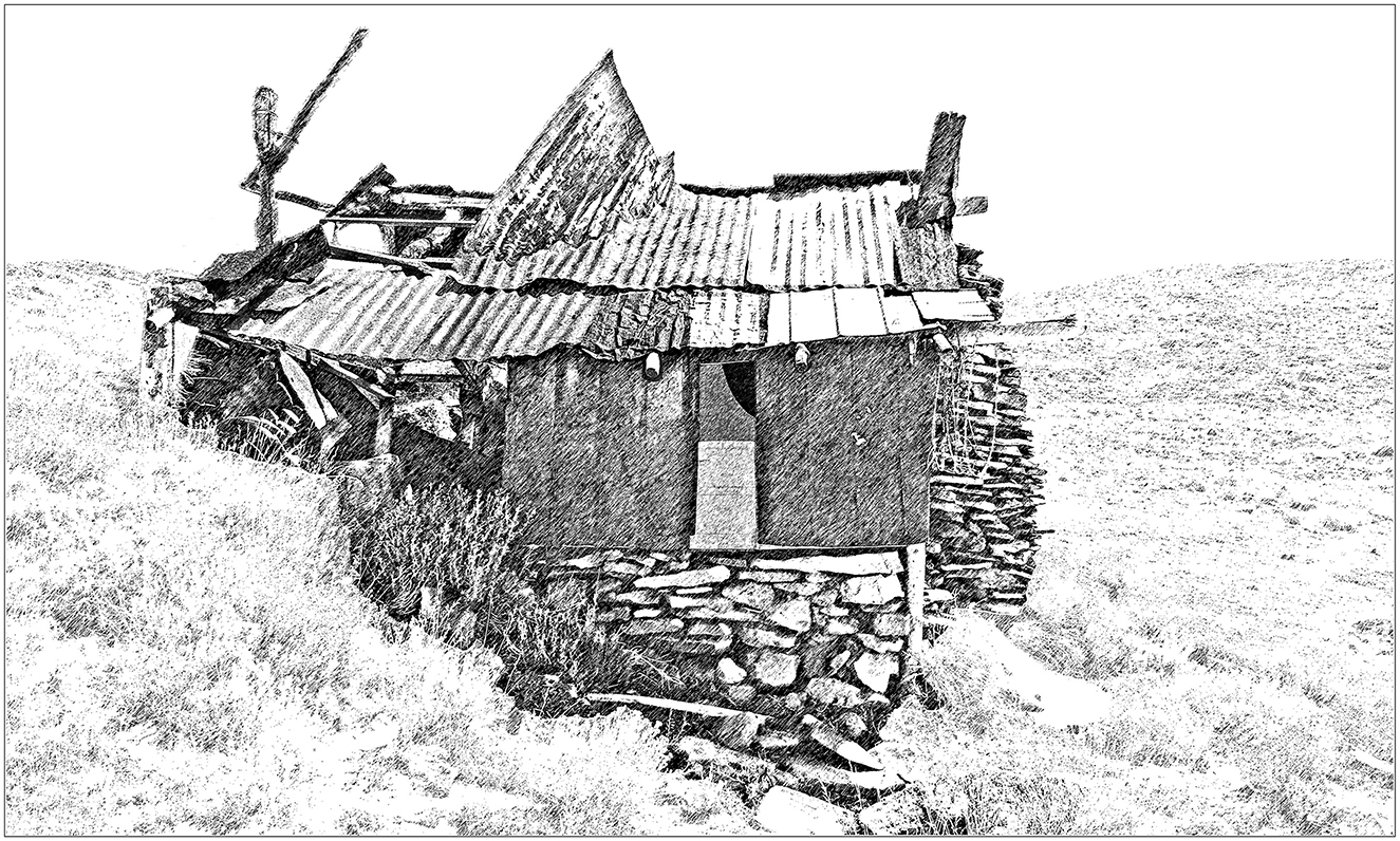 A black and white illustration of a dilapidated wooden shack with uneven planks and a slanted roof. The structure stands on a grassy field, suggesting abandonment and decay.