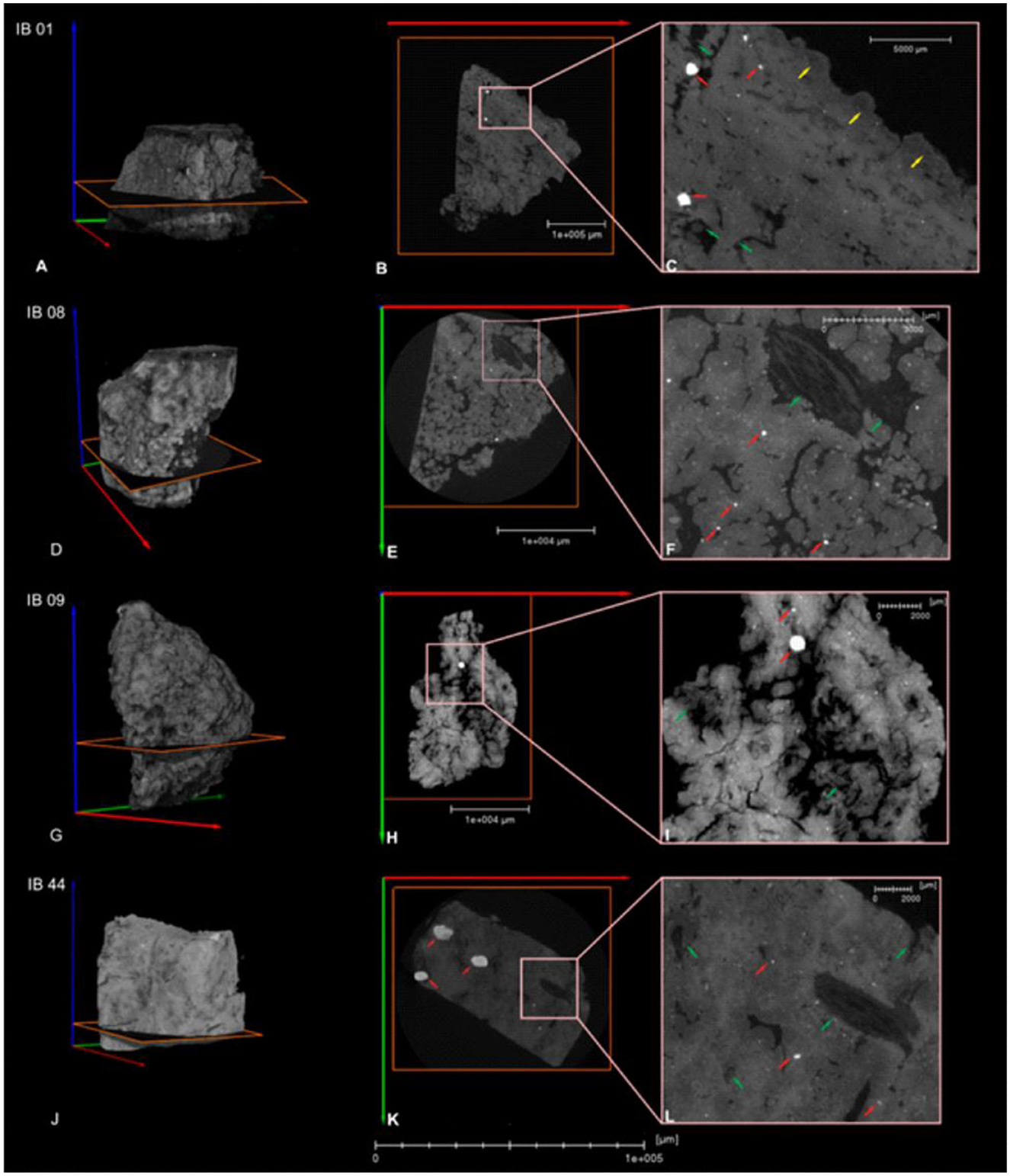 Figure 1. Micro-CT- Structure Type 01(S1) - IB01, IB08, IB09, and IB44(A, D, G, J) Microtomographic fragments; (B, E, H, K) View section XY; (C, F, I, L) Details of fabric, with grayscale matrix, dark crust (yellow arrows), minerals (red arrows); and organic material (green arrows).