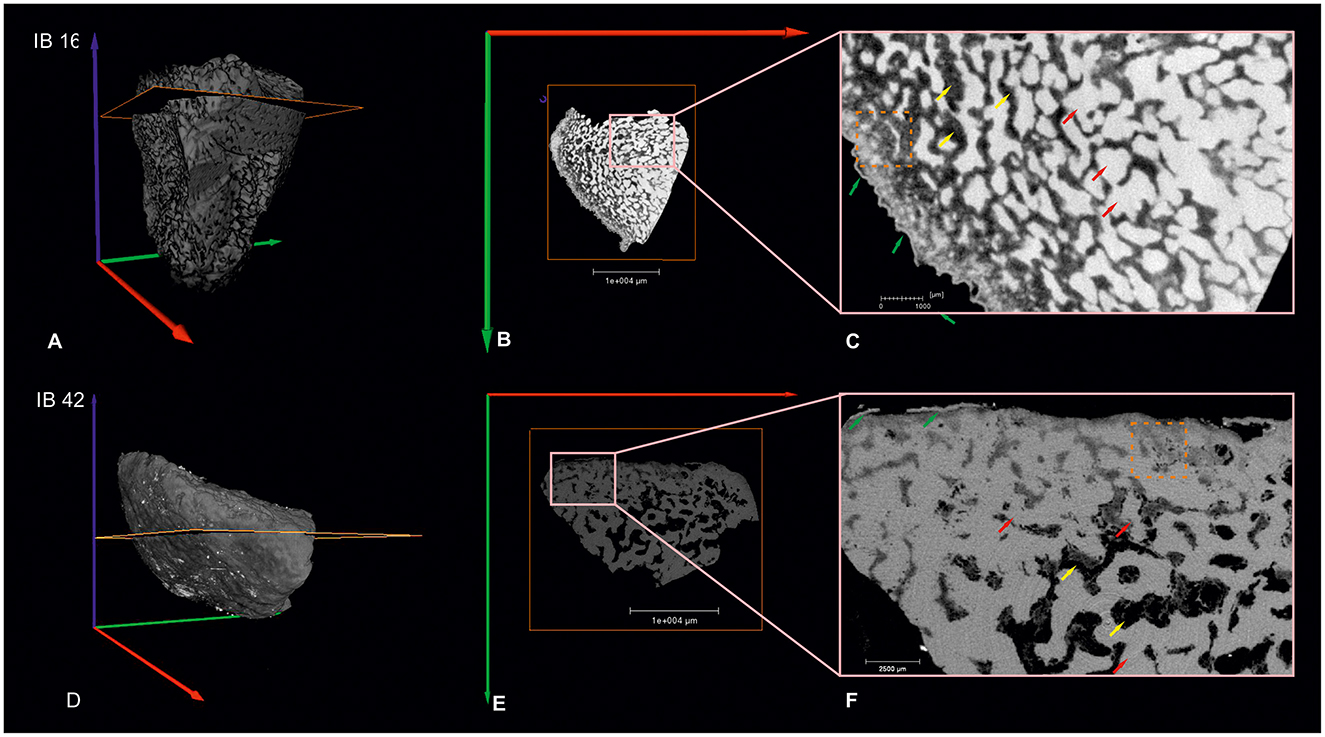 Figure 2. Structure type 02: IB16 and IB42: (A, D) Microtomographic fragments; (B, E) View section XY; (C, F) Detail View with different areas: Crust (green arrows); High dense area (red arrows); Light dense area (yellow arrows); Example of medium gray is the mixture area (red dotted square).