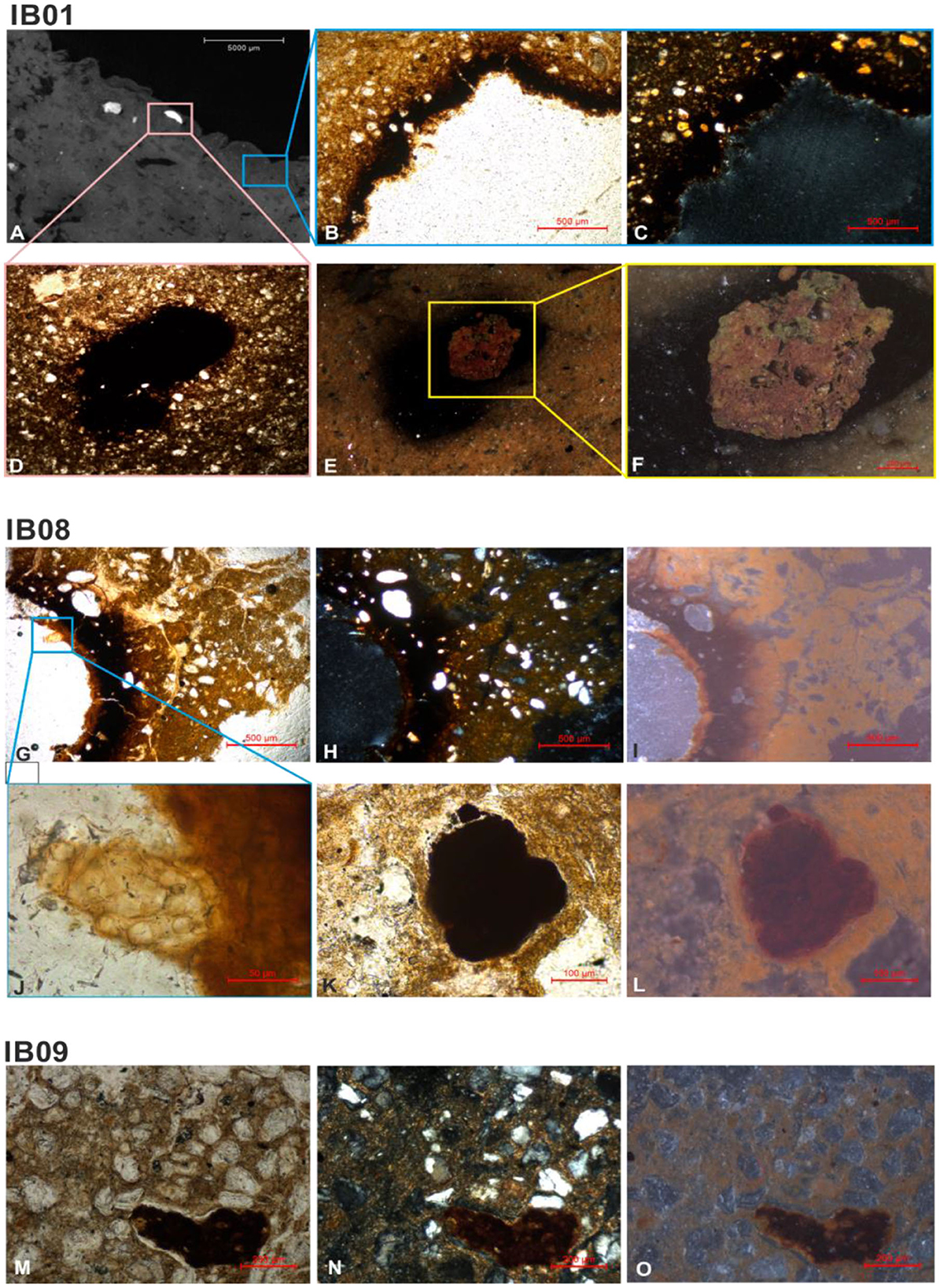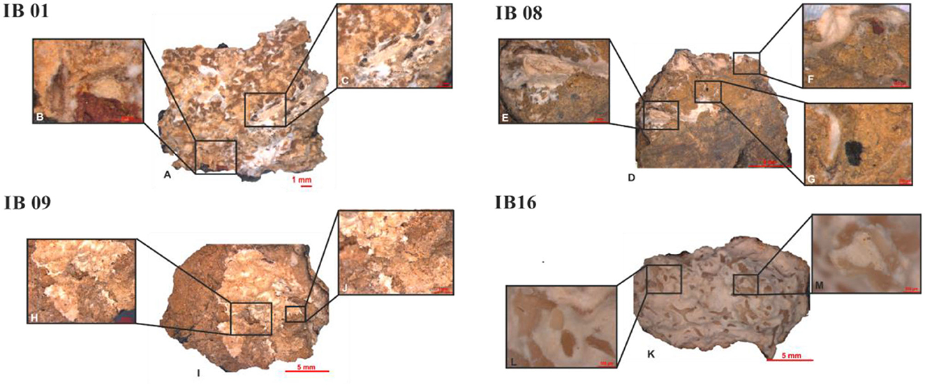 Figure 3. IB01: (A) Fragment mosaic image; (B) Iron nodule; (C) Plant residue; IB08: (D) Fragment mosaic image; (E) Fiber plant residue; (F) Iron nodule and white infillings; (G) Charcoal; IB09: (H) White Infillings; (I) Fragment mosaic image; (J) White and brown infillings; IB16: (K) Fragment mosaic image; (L) Spongy texture detail; (M) Fibers concentration with black and red spots. Images in oblique incident light.