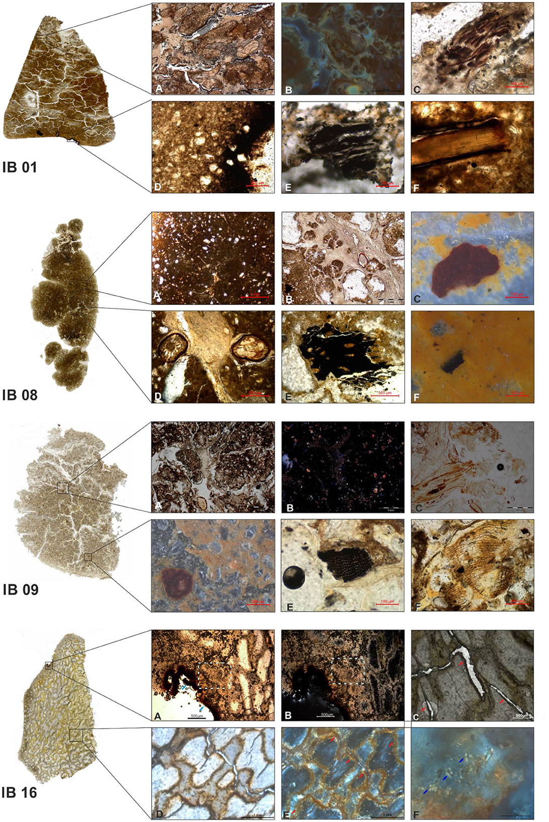 Figure 4. Petrographic photomicrographs of IB01: (A) Fabric with clay and organic coatings/infillings, 2,5x, PPL; (B) Organic coatings and infillings, 5x, FLS; (C) Amorphous organic material, 20x, PPL; (D) Crust and quartz grains, 10x, PPL; (E) Microcharcoal, 10x, PPL; (F) Plant residue. IB08: (A) Fabric, with clay and quartz grains 5x, PPL; (B) Organic infillings, 2,5x, PPL; (C) Iron nodule, 20x, OIL; (D) Organic infillings and fragment, 5x, PPL; (E) Charcoal fragments in micromass, 5x, PPL; (F) Microcharcoal, 20x, OIL. IB09: (A) Fabric with clay, organic fragment, and organic infillings, 2,5x, PPL; (B) Same, XPL: (C) Plant residue, 10x, PPL; (D) Iron nodule, 10x, OIL; (E) Charcoal, 20x, PPL; (F) Plant residue. IB16: (A) Fabric and Crust (blue arrow), an area with preserved starches (blue dashed square), 5x, PPL; (B) same, XPL; (C) Plannar voids, 10x, PPL; (D) Fabric and Voids, 2,5x, PPL; (E) Starches concentration area (red arrows), 2,5, XPL; (F) Starches, 50x, XPL.