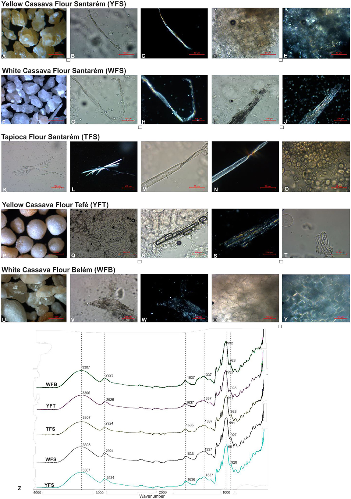 Figure 5. Cassava flour experiment: YFS: (A) Original sample, 2.5x, OIL; (B) Elongate fiber, 50x, PPL; (C) Same B, XPL; (D) Aggregates fibers, 50x, PPL; (E) Same D, XPL; WFS: (F) Original sample, 2.5x, OIL; (G) Elongate fiber, 20x, PPL; (H) Same G, XPL; (I) Aggregates elongate fibers, 10x, PPL; (J) Same I, XPL; TFS: (K) Oxalate, 20x, PPL: (L) Same K, XPL; (M) Elongate fibers, 50x, PPL; (N) Same M, XPL; (O) Starches, 50x, PPL; YFT: (P) Original sample, rounded shape, 2.5x, OIL; (Q) Preserved fibers, 5x, PPL; (R) Elongate fibers, 20x, PPL; (S) Same R, XPL; (T) Pioneer fiber, 50x, PPL; (U) WFB - U- Original samples, 2,5, OIL; (V) Aggregate fibers, 10x, PPL; (X) Altered starches -gelatinization process, 20x, PPL; (Y) Same X, XPL; (Z) FTIR spectra experiments sample.