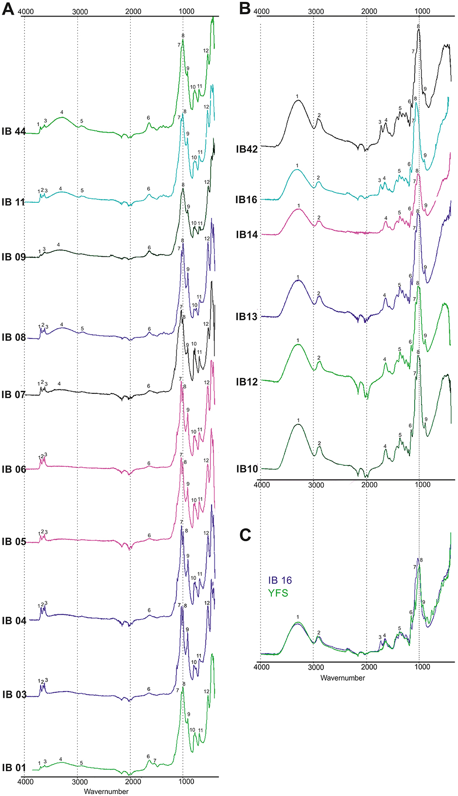 Spectroscopic analysis with three panels (A, B, C) showing multiple infrared spectra of samples labeled IB01 to IB44. Panel A features eight spectra; B has six; C compares two spectra, IB16 and YFW, over a wavenumber range of four thousand to one thousand. Each spectrum is differently colored, indicating distinct sample profiles. Peaks are numbered, reflecting specific absorbance values unique to each sample. The graphs illustrate variances in molecular composition or reactions across samples.