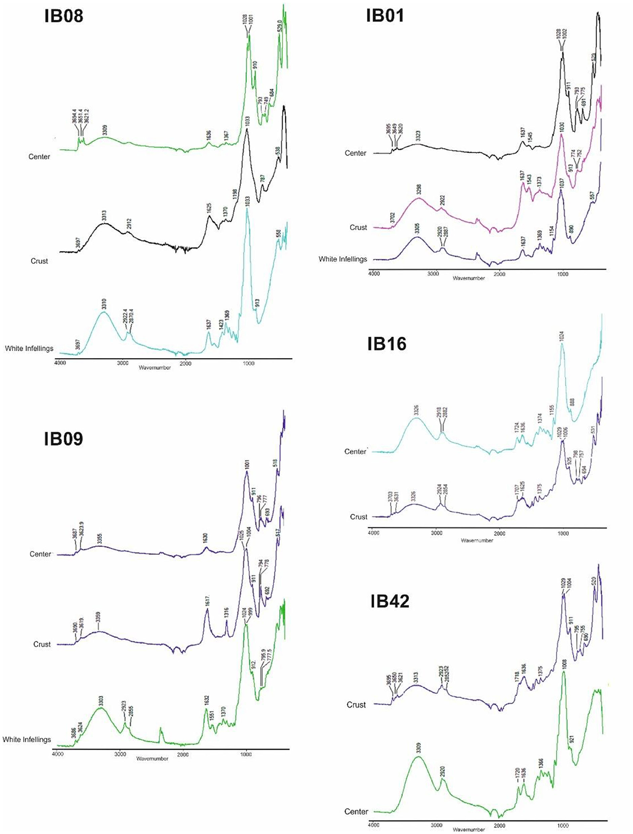 The differences in the mosaic images of IB01 and IB16 are discrete: the colors and textures of IB16 are noticeable to the naked eye, while the distinctions in the brown-toned areas of IB01 are less evident. Furthermore, IB01 contains fragments of clay nodules, plant macro-fragments, and wood charcoal, which are visible with the aid of a stereoscope.