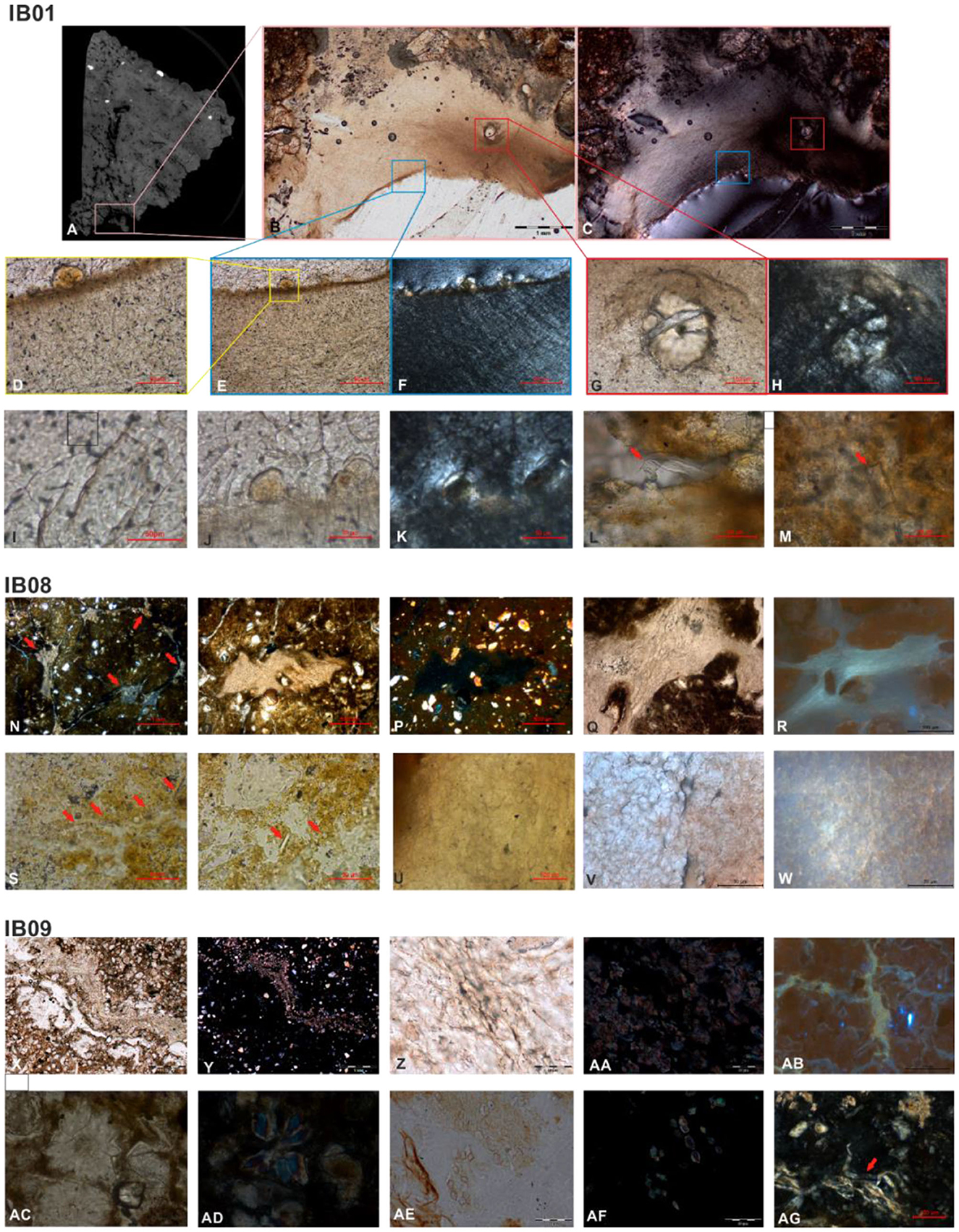 Sample IB16 exhibited a compact microstructure, with planar voids occupying approximately 1% of the area (Figures 4 IB 16 C, D). The thin section showed two distinct regions under PPL: a yellowish area with a speckled b-fabric, ranging from gray to yellow and displaying high optical activity, and a second colorless area with an undifferentiated b-fabric (Figures 4 IB16 DF). The crust of the sample was reddish under PPL and exhibited an undifferentiated b-fabric (Figures 4 IB16 A, B). This sample was classified as S2 in micro-CT analyses.