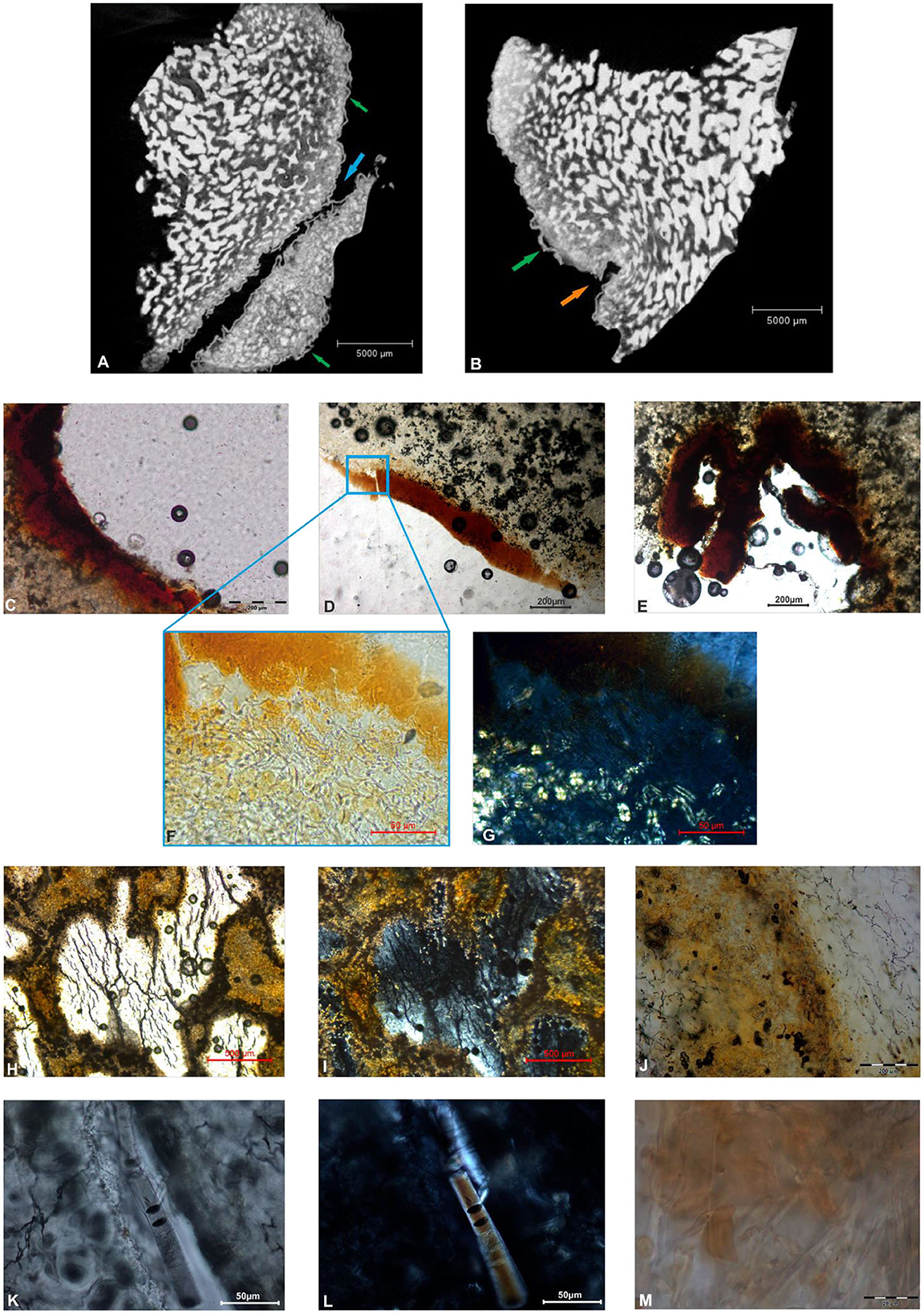 In IB16, a spongy mass with light brown and white coloration was identified with the naked eye. Stereoscopic analysis, in addition to constructing the mosaic of the fragment, revealed small, darkened spots, and reddish points. No void areas were identified (Figures 3KM).