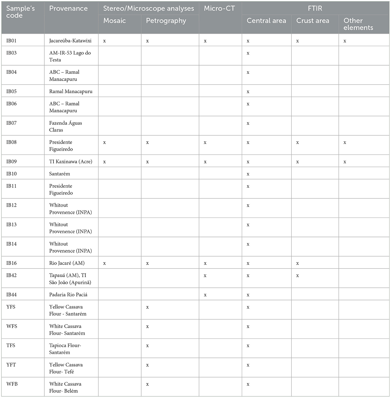 Based on the survey of 44 samples conducted by Furquim in different institutions in Brazil (Furquim, 2024), the analyses were carried out according to the type of material available: imaging analyses on samples from which fragments could be collected, and FTIR analyses on samples from which powdered, and fragment material could be obtained.