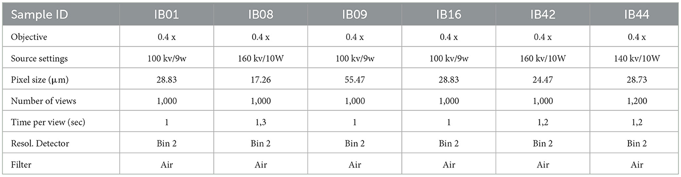 Six fragments of Indigenous breads (IB01, IB08, IB09, IB16, IB42, and IB44) were scanned using Micro-CT. This technique enables the creation of high-solution three-dimensional images of the material's internal structure, facilitates the observation of external surface marks, and allows detailed volumetric analyses. The scans were carried out using the ZEISS Xradia Versa XRM-510 (micro-CT). For image reconstruction, Scout and Scan-Control System Reconstructor were employed, and the analyses were performed with Avizo 8.1. The use of microtomography complements the analysis of the slides, allowing for the observation of void dispersions in three dimensions and the detailed examination of features such as the bread crust. The specific parameters of each scan are detailed in Table 2.