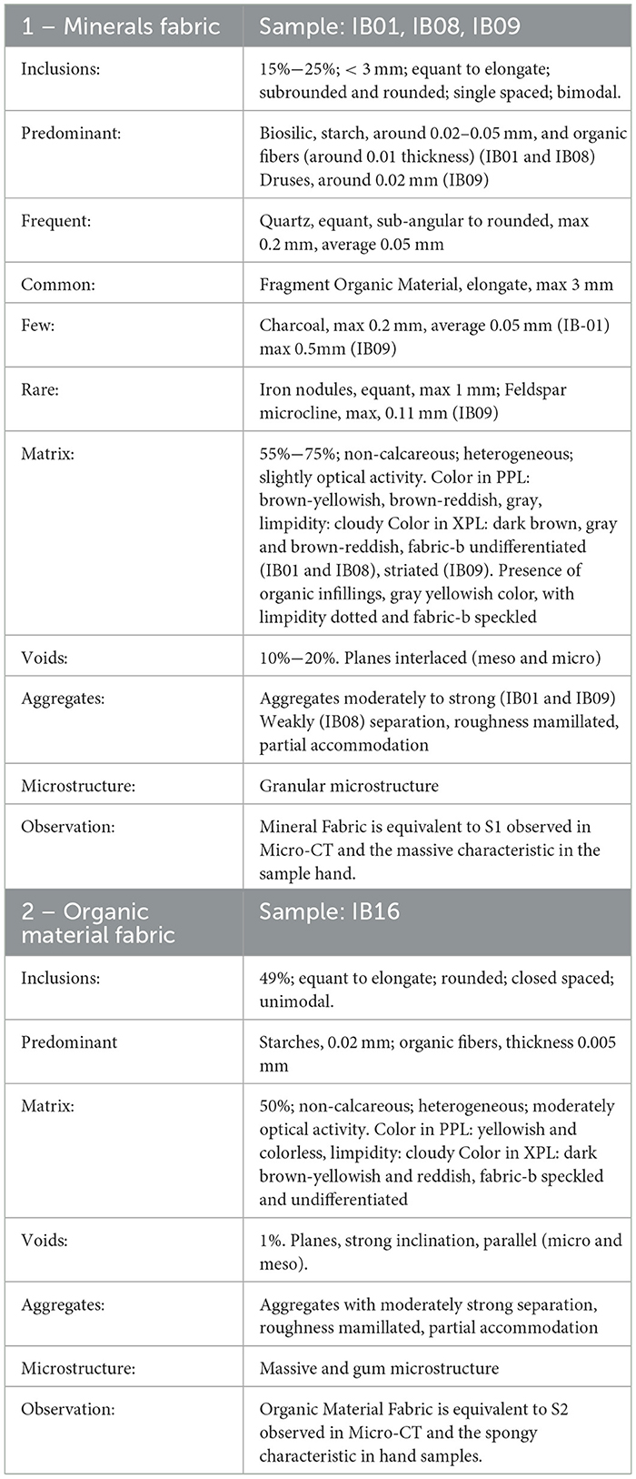 All samples with a mineral fabric exhibited similar characteristics, including quartz grains in the fine sand-silt fraction, iron oxide nodules, amorphous organic materials, plant fragments, and microcharcoals. Mineral fabric (F1) samples are classified as S1 in micro-CT analyses (Figures 4 IB01, IB08, IB09 A–F).