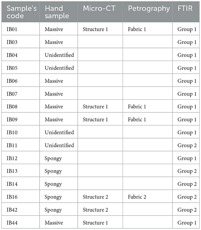 The study of samples IB01, IB08, and IB09 confirmed the presence of organic and inorganic materials and an irregular microstructure. Notably, some void areas that appeared ambiguous in the micro-CT scans were determined to be filled with source organic material upon closer examination. In contrast, sample IB16 consisted of a mixture of starch and fibers, resulting in a compact biomass structure. Details of the different microstructure types are presented in Table 3, and specific descriptions of each sample are in the Supplementary material.
