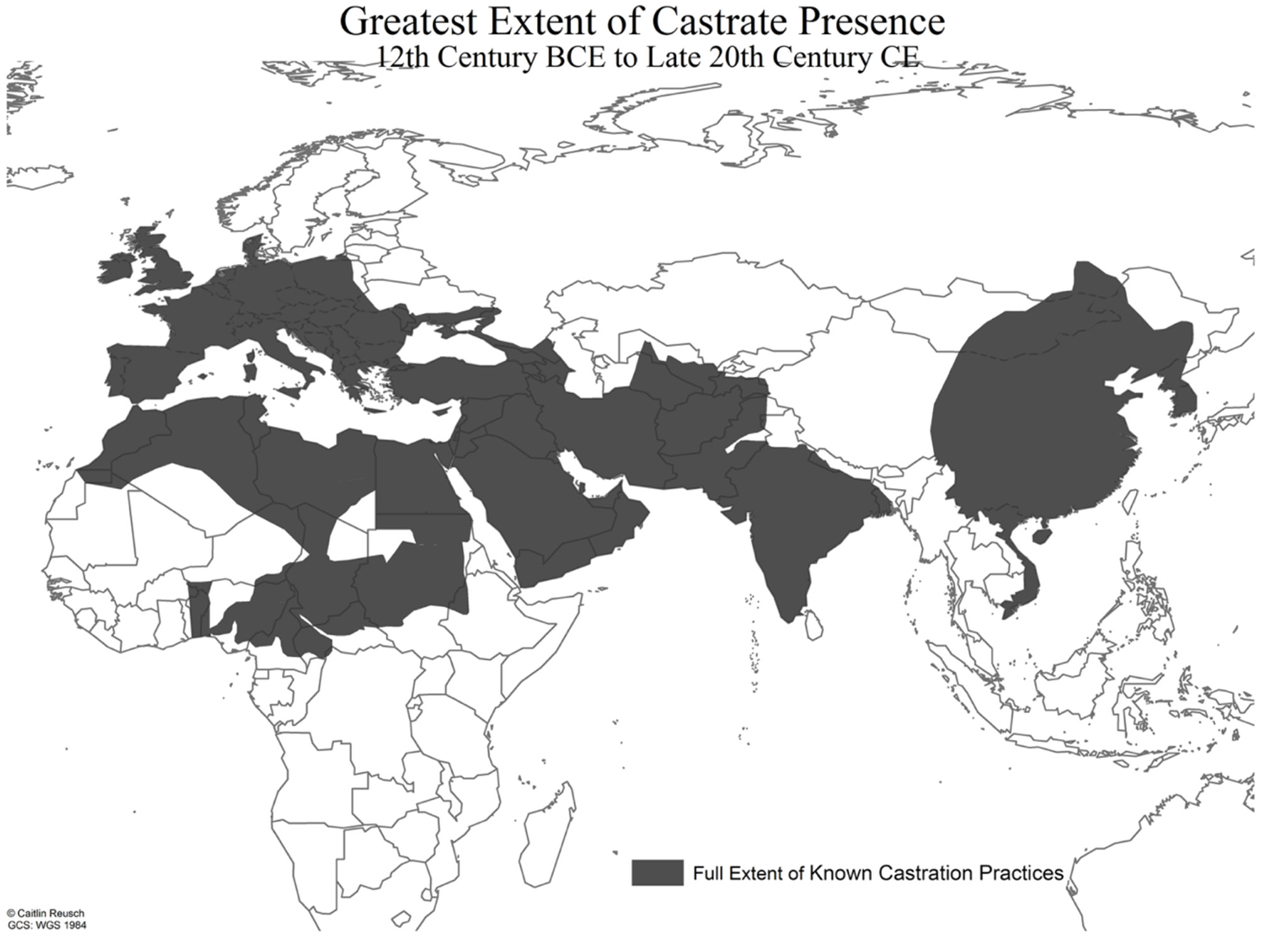 Castration as a practice likely dates back to the Secondary Products Revolution1 and the need to retain male animals for wool and traction without interrupting breeding programs. Human castration has a murkier origin, potentially also dating back to the Secondary Products Revolution, but the earliest definitive written references to it date back circa 4000 BCE, in hymns to the goddess Ishtar from Uruk (Ringrose, 2003; Tougher, 2008; Reusch, 2013a; Taylor, 2002). Since this time, castration has been found in one or more strongly hierarchical civilizations across Afro-Eurasia, with castrated individuals fulfilling multiple roles within these societies (Tougher, 2008; Ringrose, 2003; Patterson, 1982; Reusch, 2013a; Hopkins, 1978, 1963). While the view of castrates2 varied across time and space, they tended to occupy fairly liminal sociocultural positions due to the perception of their physical bodies, making them desirable servants and slaves and leading to a large market for castrated individuals. However, the medical practice of castration was rarely discussed, other than to ban its use within the borders of an empire, and the resulting medical needs of castrates were rarely, if ever, mentioned within the various writings of intact males, who frequently disparaged castrates (Reusch, 2013a,b). Despite this, castrates were often seen to band together to accommodate for their medical, parochial, and funerary needs (Reusch, 2020).