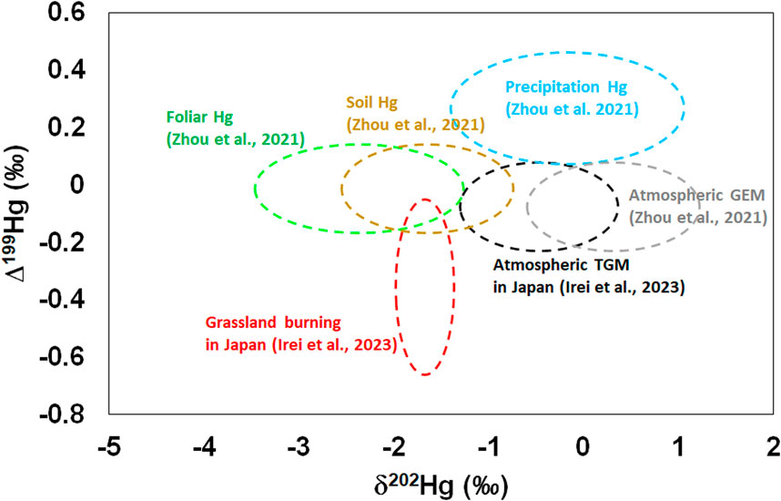Figure 1. Variations of δ202Hg and Δ199Hg reported for Hg from different sources. Ellipses represent Hg from foliar (green), soil (brown), precipitation (blue), atmospheric GEM (gray), atmospheric TGM (black), and grassland burning in Japan (red). Data reported by Zhou et al., 2021, and Irei et al., 2023 were adopted.