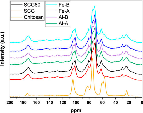In line with a previous report, a physical blend of the constituents was obtained by compositing biomass, chitosan, and MO additives (Steiger et al., 2023). To highlight the nature of the blend and the obtained adsorbents, characterization in the form of 13C solids NMR spectroscopy was performed (see Figure 1).