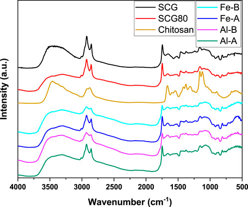 Specifically, for chitosan has a relatively strong band at approximately 3,470 cm-1 is noted, along with broad bands for SCG, SCG80, and the four mineral oxide composites. This indicates the increased presence of amine groups, mainly to the OH-groups in the composites and SCG. In contrast, a small band at 3,010 cm-1 (C–H stretching in cis C=C bands) appears in SCG, which is in agreement with a detailed study by Zuluaga et al. (2024). C–H groups (symmetric and asymmetric stretching) are visible at approximately 2,931 cm-1 and 2,852 cm-1, respectively. A band at 1,748 cm-1 (absent in chitosan) indicates the presence of C=O groups (fatty acid esters in SCG). A relatively strong band, which is abated in the composites and SCG at 1,669 cm-1, was assigned to amide bending. Similarly, bands at 1,167 cm-1 and 1,121 cm-1 are pronounced for chitosan, and they were assigned to the glycosidic linkage (C–O–C). These bands are abated in SCG and the resulting composites. No specific iron or aluminum oxide signals could be assigned within the composites due to their relatively low content, highlighting the physically blended nature of the composites (Radwan-Pragłowska et al., 2019).