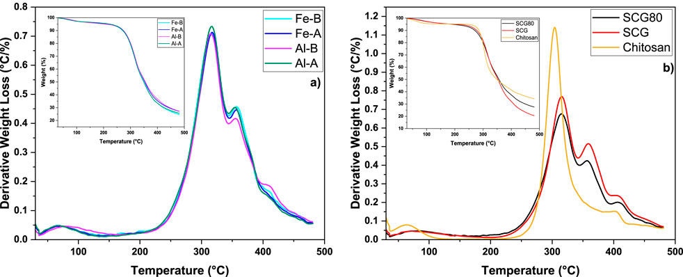 Thermogravimetric Analysis (TGA) graphs were the first graphs displays derivative weight loss. The second graph (b). Two graphs display derivative weight loss versus temperature. Graph (a) compares the thermogravimetry profiles of Fe-B, Fe-A, Al-B, and Al-A materials, showing peaks around 350°C. Inset shows corresponding weight loss curves. Graph (b) contrasts the temperature derivative thermogravimetry profiles of SCG80, SCG, and Chitosan, with a prominent peak near 300°C. The inset depicts their weight loss curves.