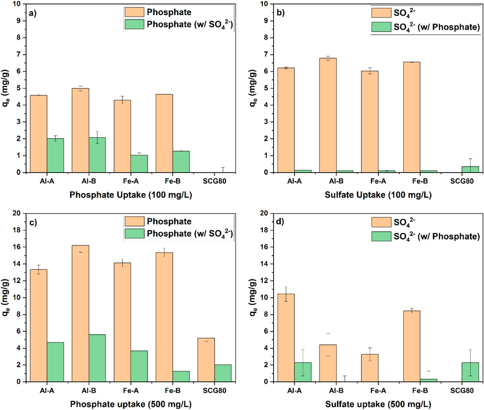 To gain insights into potential selectivity toward phosphate by the adsorbents, single-point adsorption analyses at equilibrium with a common competitor anion (sulfate) were conducted (see Figure 4).