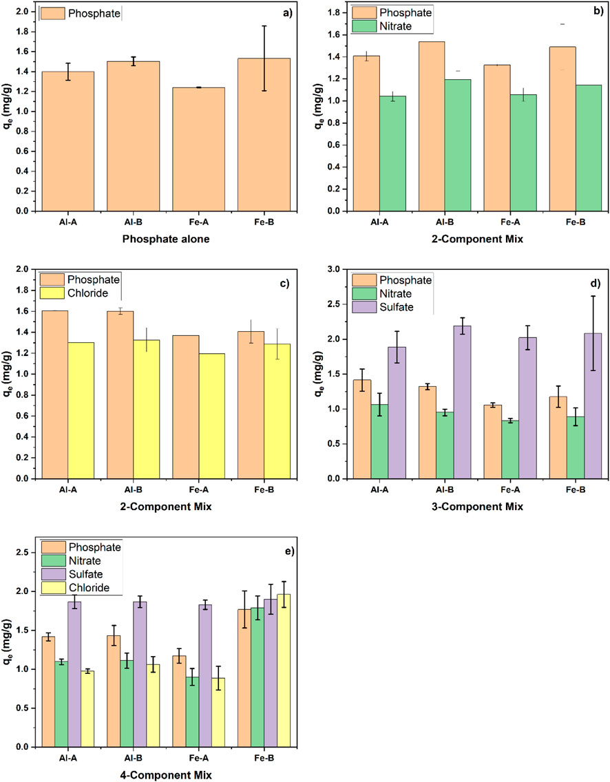 Five bar charts labeled a) to e) show adsorption capacities of various ions on different adsorbents. Chart a) depicts phosphate alone. Chart b) shows phosphate and nitrate in a two-component mix. Chart c) displays phosphate and chloride in a two-component mix. Chart d) illustrates phosphate, nitrate, and sulfate in a three-component mix. Chart e) presents phosphate, nitrate, sulfate, and chloride in a four-component mix. Adsorbents are Al-A, Al-B, Fe-A, and Fe-B. Error bars indicate variability.