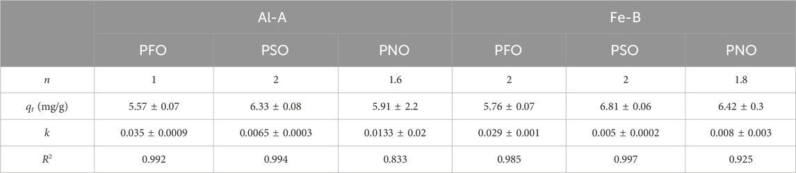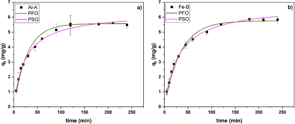 Table 3. PFO and PSO kinetic profile data for Al-A and Fe-B. k is expressed in min-1 for the PFO kinetic rate constant and g mg-1 min-1 for the PSO kinetic rate constant.