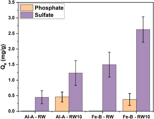 Bar graph comparing adsorption of phosphate and sulfate on different materials. The y-axis shows adsorption capacity (Qe) in milligrams per gram, ranging from zero to 3.5. Orange bars represent phosphate and purple bars represent sulfate. Four materials are analyzed: Al-A-RW, Al-A-RW10, Fe-B-RW, and Fe-B-RW10. Sulfate shows higher adsorption capacity across all materials, with Fe-B-RW10 exhibiting the highest value around 3.