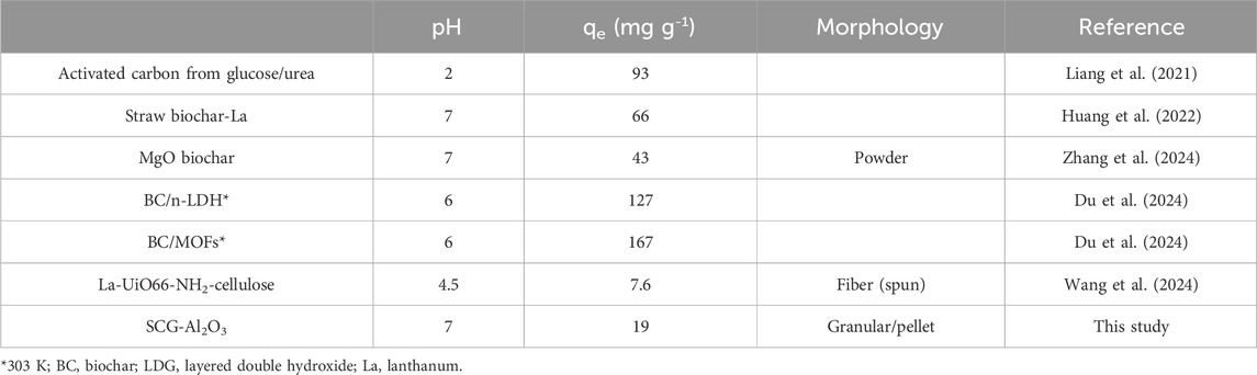 Based on trends in the conditions for aquatic environments, the background levels of common oxyanions rarely exceed 50 mg/L (nitrate) or 2 mg/L–5 mg/L (phosphate), while the sulfate levels can range between 75 mg/L and 6,000 mg/L or higher, depending on the aquatic environment (Solgi et al., 2024). The isotherm studies for Pi provide insights into the adsorption process (e.g., Langmuir or Freundlich isotherms), and they often far exceed the environmentally relevant levels (<5 mg/L–10 mg/L) to reach a maximum adsorption capacity. Hence, the maximum adsorption capacity may not be relevant in environmental samples, and uptake at such concentrations should be evaluated to address this limitation.