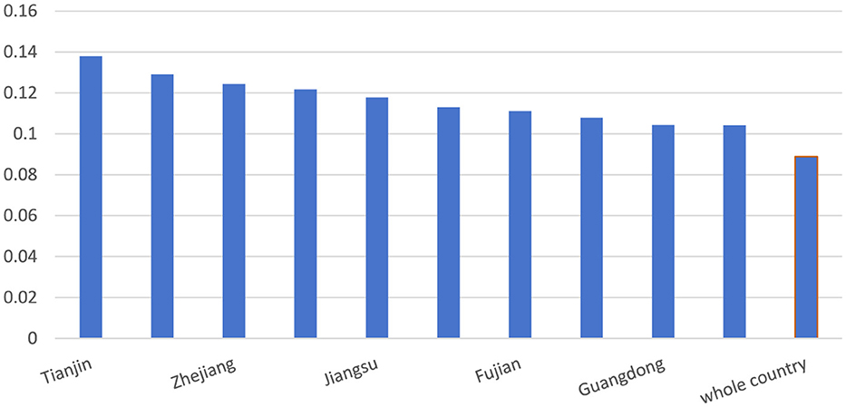 In terms of rural-urban regional coordination, there is not much difference between the top 10 provinces. Except for Hubei, which is a central province, the remaining nine provinces are all located in the eastern region (Figure 7). In terms of the coordinated development of urban and rural areas, the gap between the east, central, and western regions is huge. From another perspective, it can be argued that the realization of the value of ecological products in the central and western provinces will be promising. In terms of ecological environmental governance, the top 10 provinces are all located in the south. From the analysis of specific indicators, in addition to a good ecological background, environmental quality such as air, water, and solid waste are also important indicators reflecting the effectiveness of ecological environmental governance. It can be seen that the overall level of ecological environmental governance in southern provinces is higher than that in northern provinces. In terms of institutional and institutional construction, 17 provinces have issued guidance documents on the top- level design of the mechanism for realizing the value of ecological products at the provincial level, among which the top 10 provinces are all among them, and there are a certain number of state-level pilot demonstrations of “lucid waters and lush mountains are gold hills and silver mountains” in the province, successfully exploring the practical path of transforming the value of ecological products into economic value.